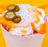 En vaso de a litro con doble porcion de elote queso amarillo, queso fresco, crema menonita y chile curtido al gusto.