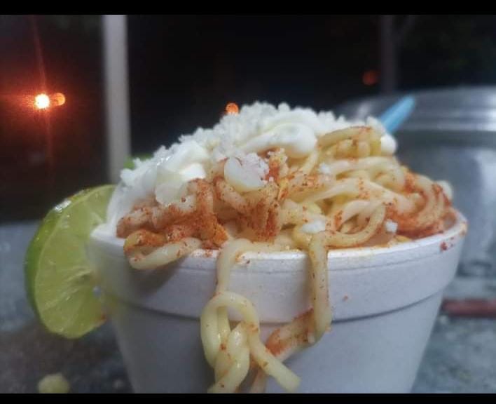 Maruchan ramen preparada, unas Sabritas a elegir, elote en grano, queso amarillo, queso blanco, crema y chile al gusto, elote.