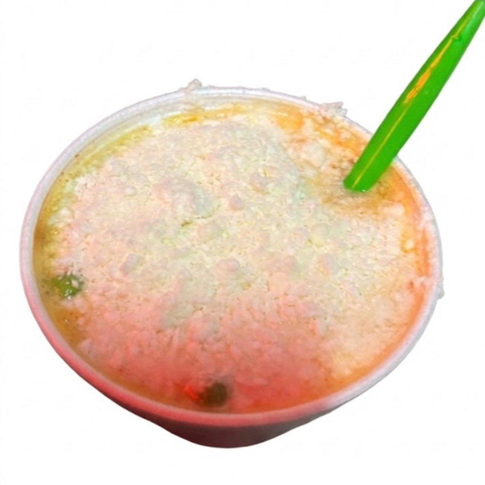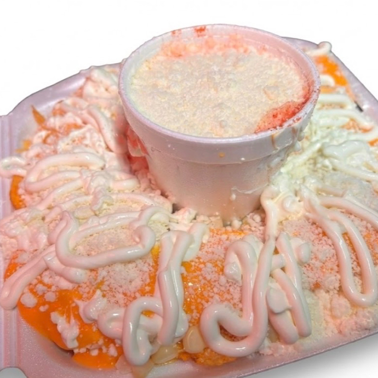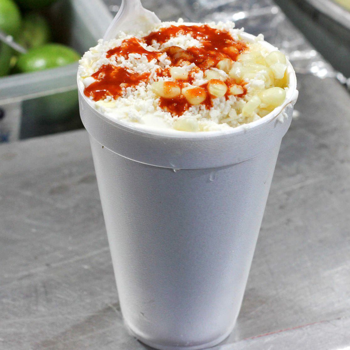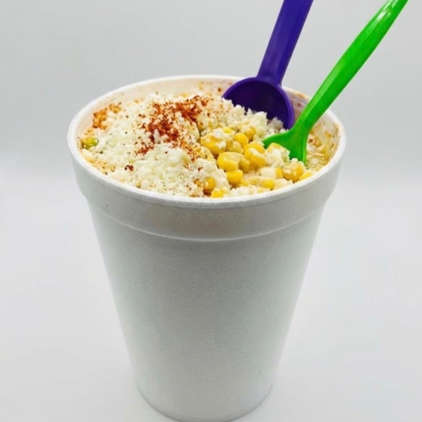 Elote en vaso, una papas a elegir al rededor, elote, queso, queso blanco y crema Chile limón