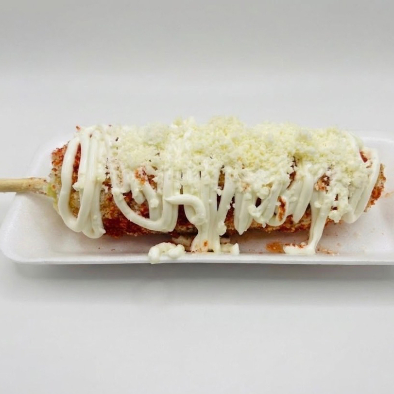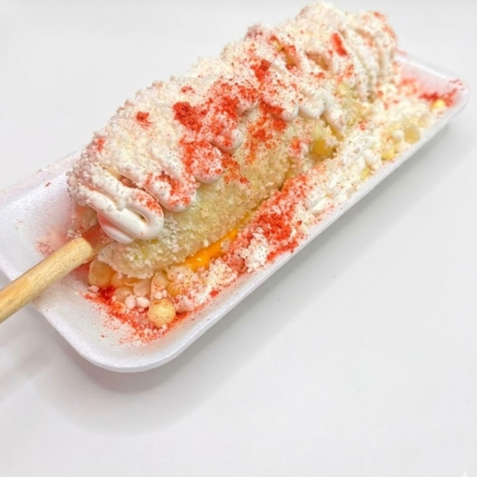 Plancha de elote preprado con crema, limón, queso y el elote entero