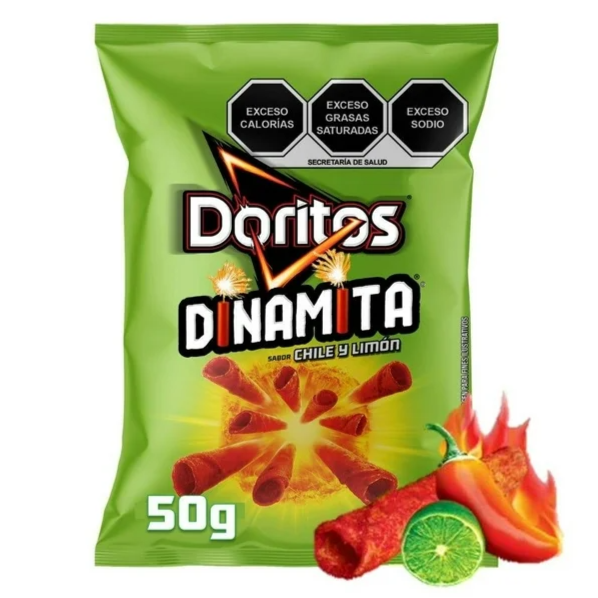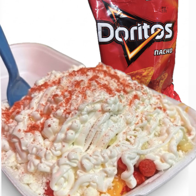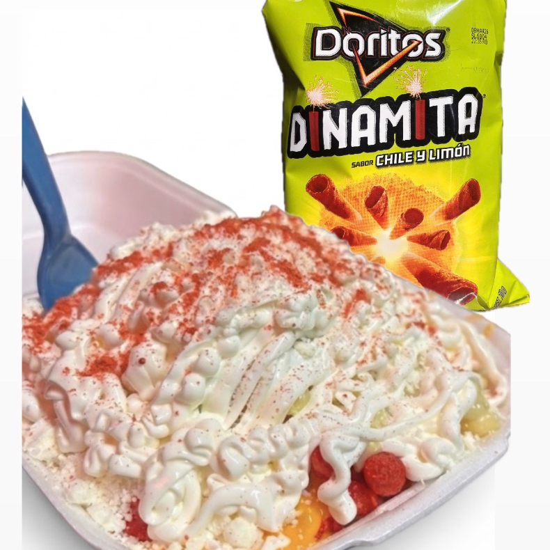 Doritos Dinamita con elote, crema, queso y queso para nachos