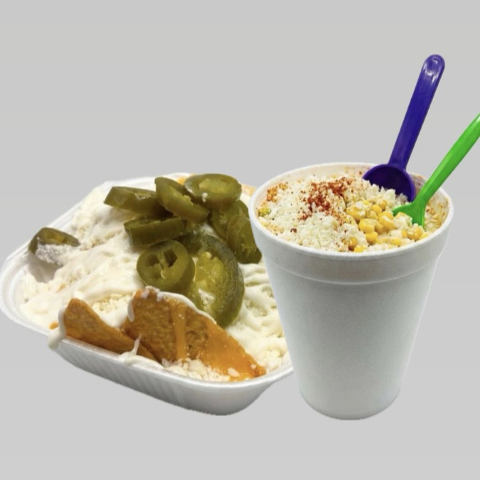 Dos papas a elegir con un elote entero, mas elote, más crema, más queso y queso para nachos