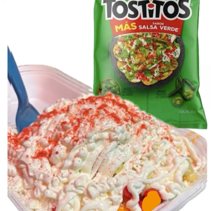 tostitos Verdes con elote, crema, queso y queso para nachos