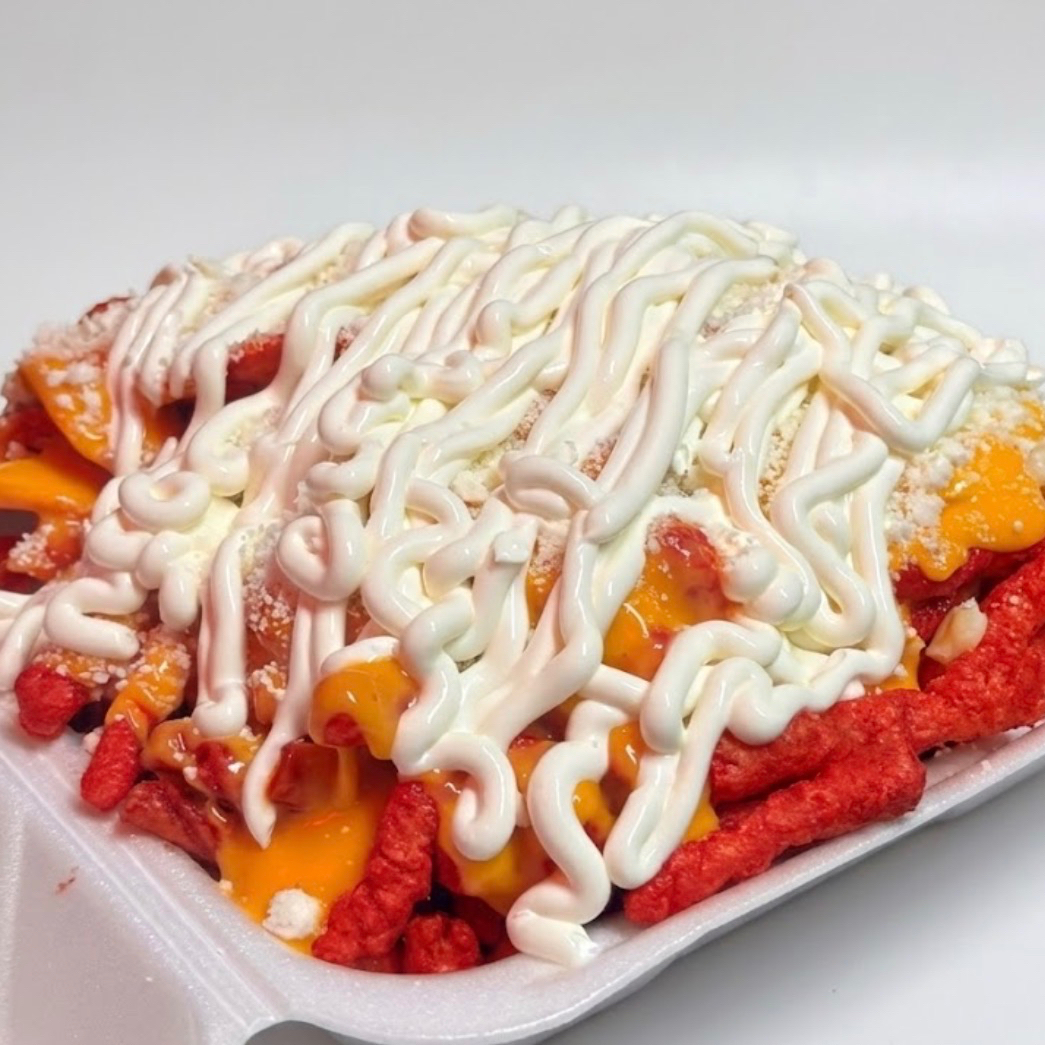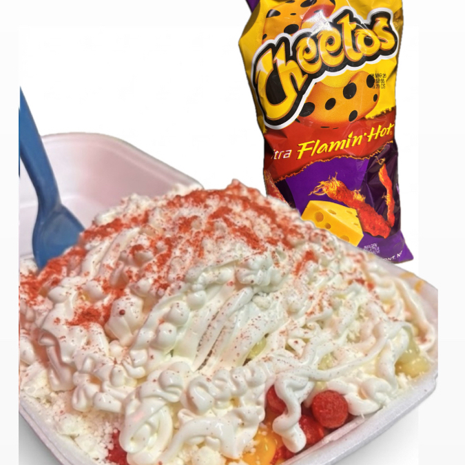 Chettos Flaming con elote, crema, queso y queso para nachos