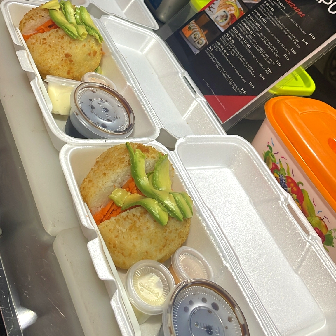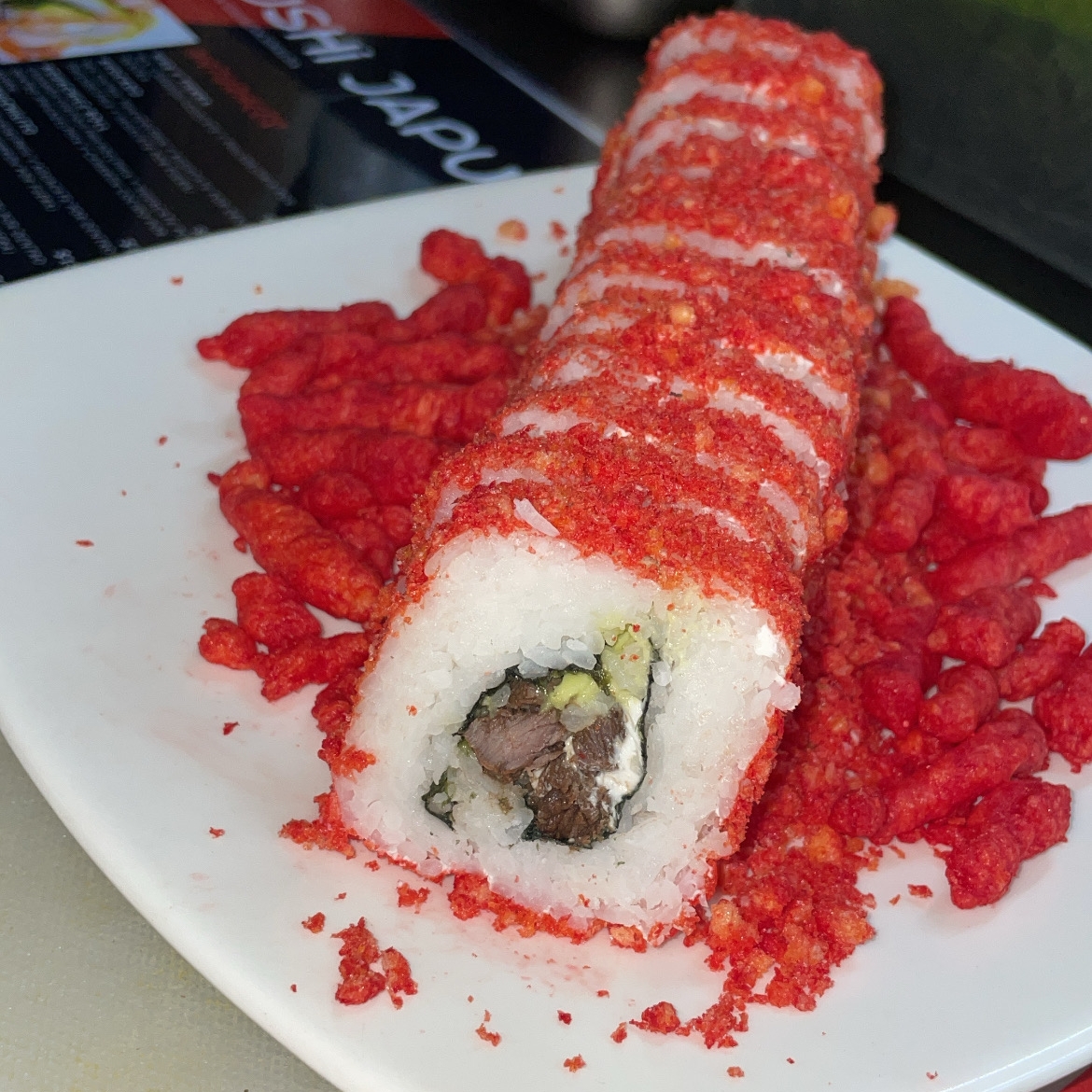 RES,PHILADELPHIA Y AGUACATE POR DENTRO (PHILADELPHIA,FORRADO EN POLVO DE FLAMIN HOT CON RESTO DE CHEETOS POR FUERA).