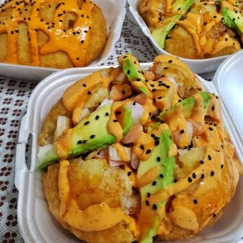 por dentro chorizo, pepino, aguacate, queso filadelfia, por fuera frio o empanizado y salsa de soya