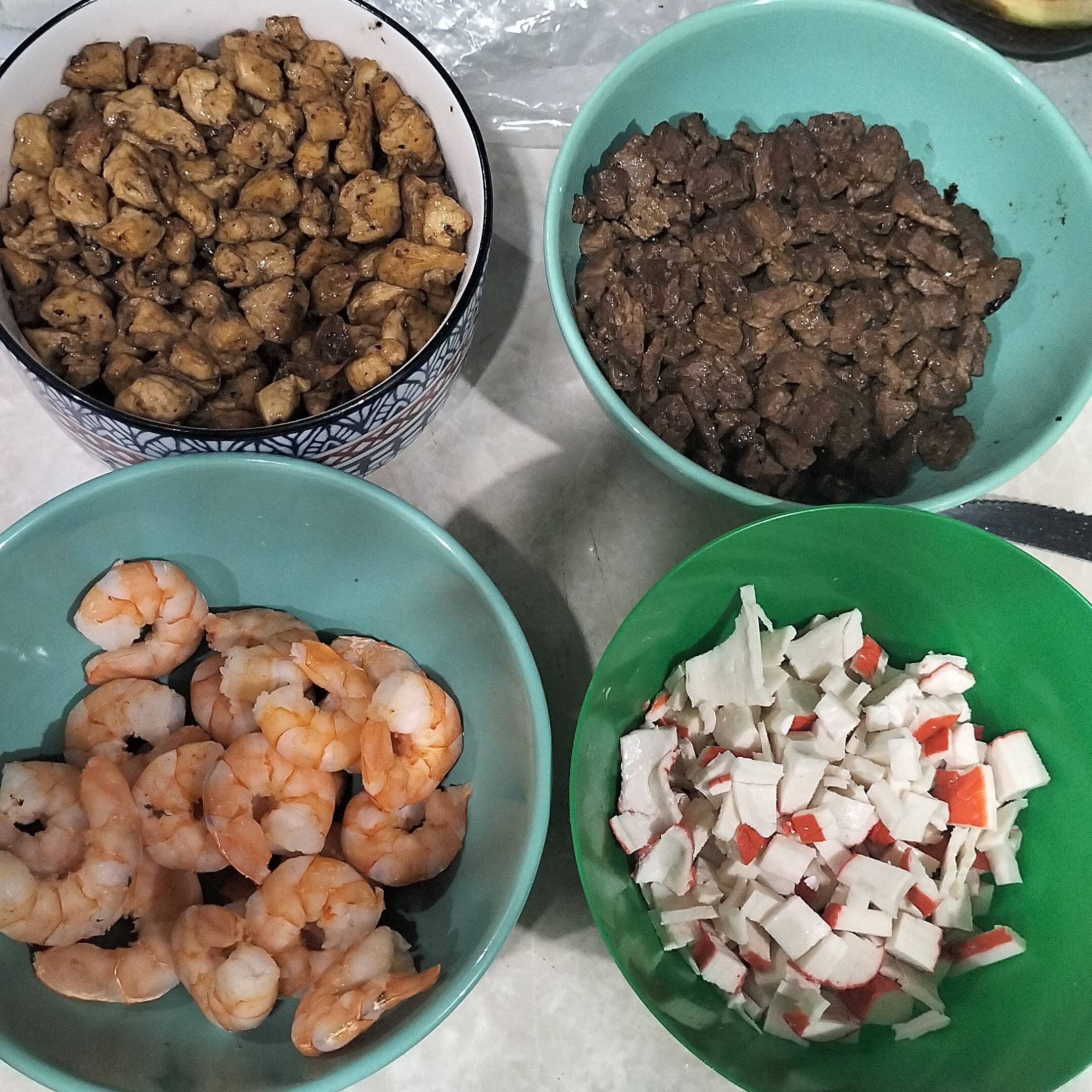 pollo,res,surimi, camaron,tocino,chorizo,ostion