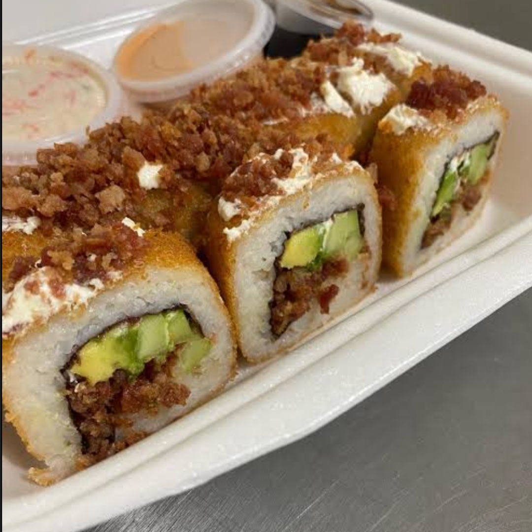 por dentro lleva tocino, aguacate, pepino, queso filadelfia, chiles toreados y alga por fuera frio o empanizado, salsa soya y chipotle
