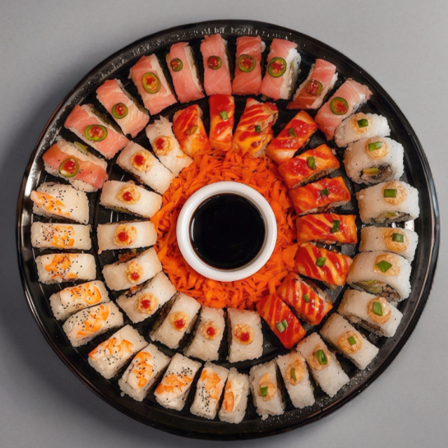 5 Rollos a tu elección, 3 aderezos Chipotle, 3 Salsa Anguila y 3 Salsa Soya.