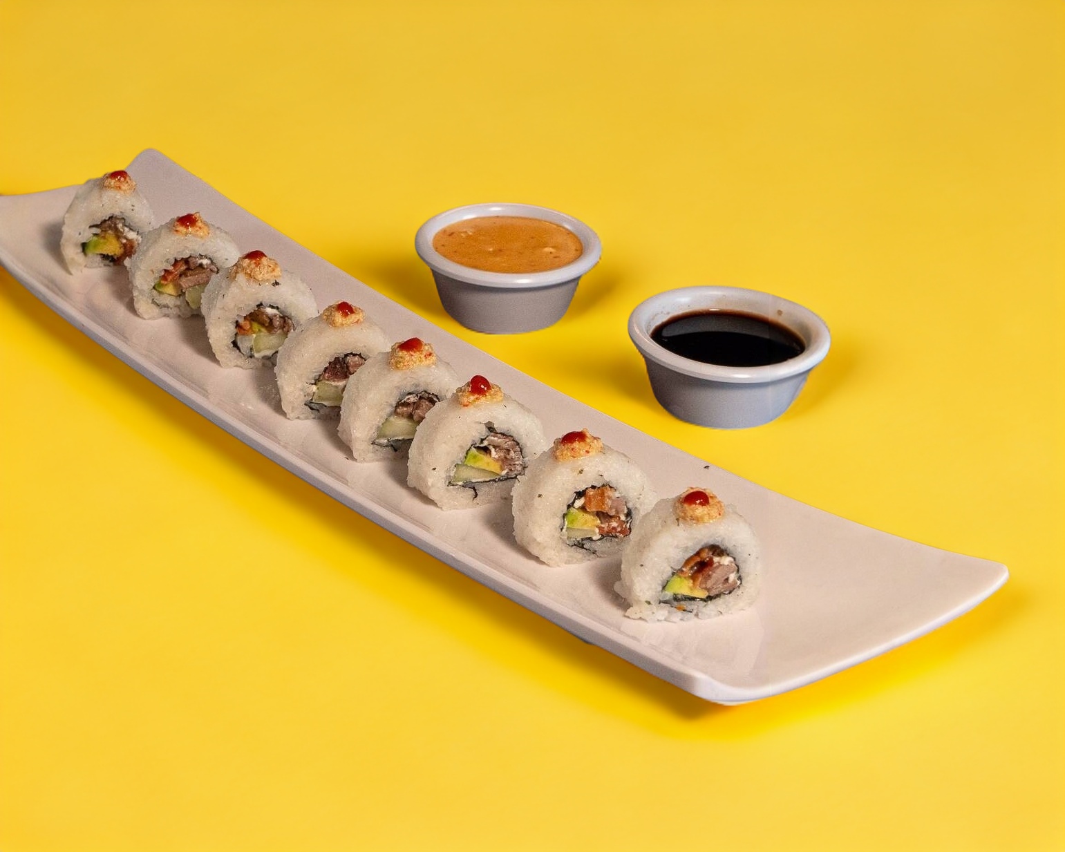 Carne de res, pepino, tocino, filadelfia y aguacate. Bañada en salsa chipotle, anguila y soya.