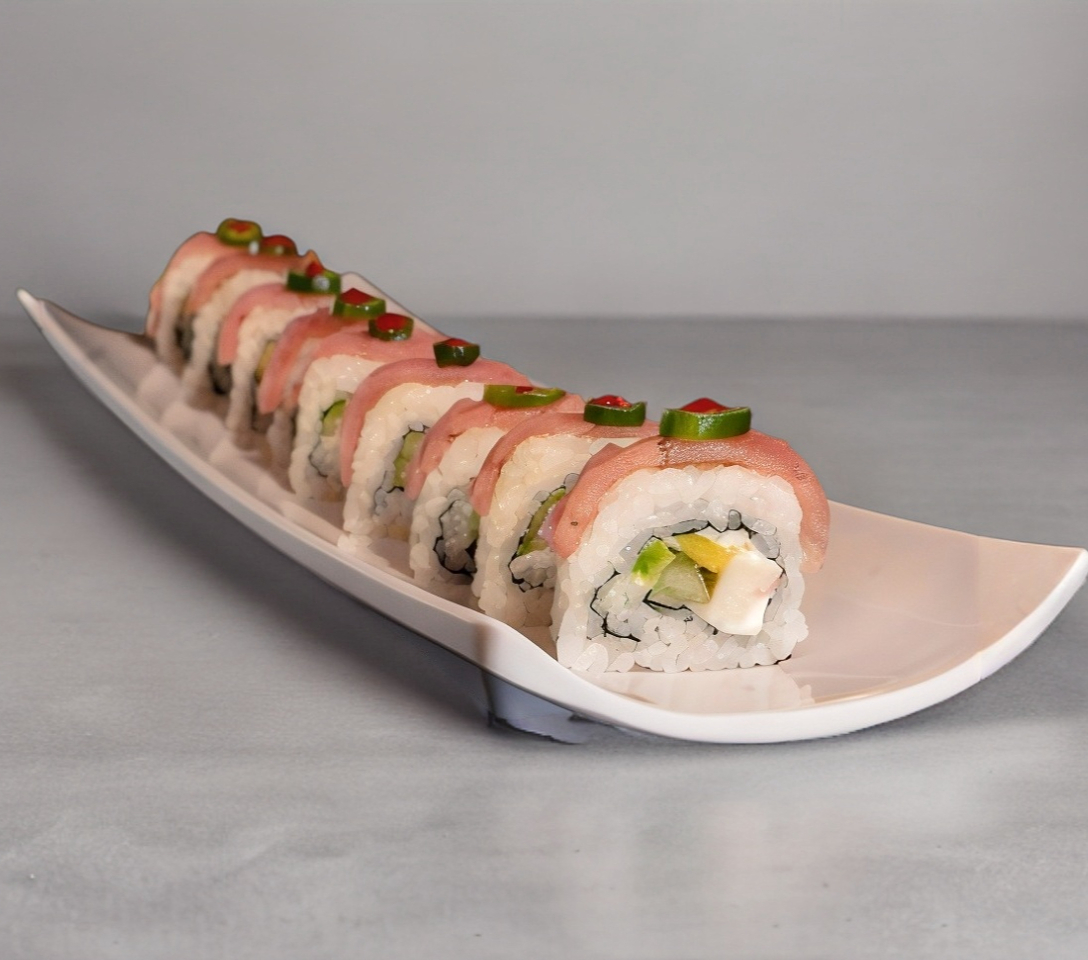 Atun fresco, pepino, surimi, filadelfia y aguacate. Bañada en salsa chipotle, anguila y soya.