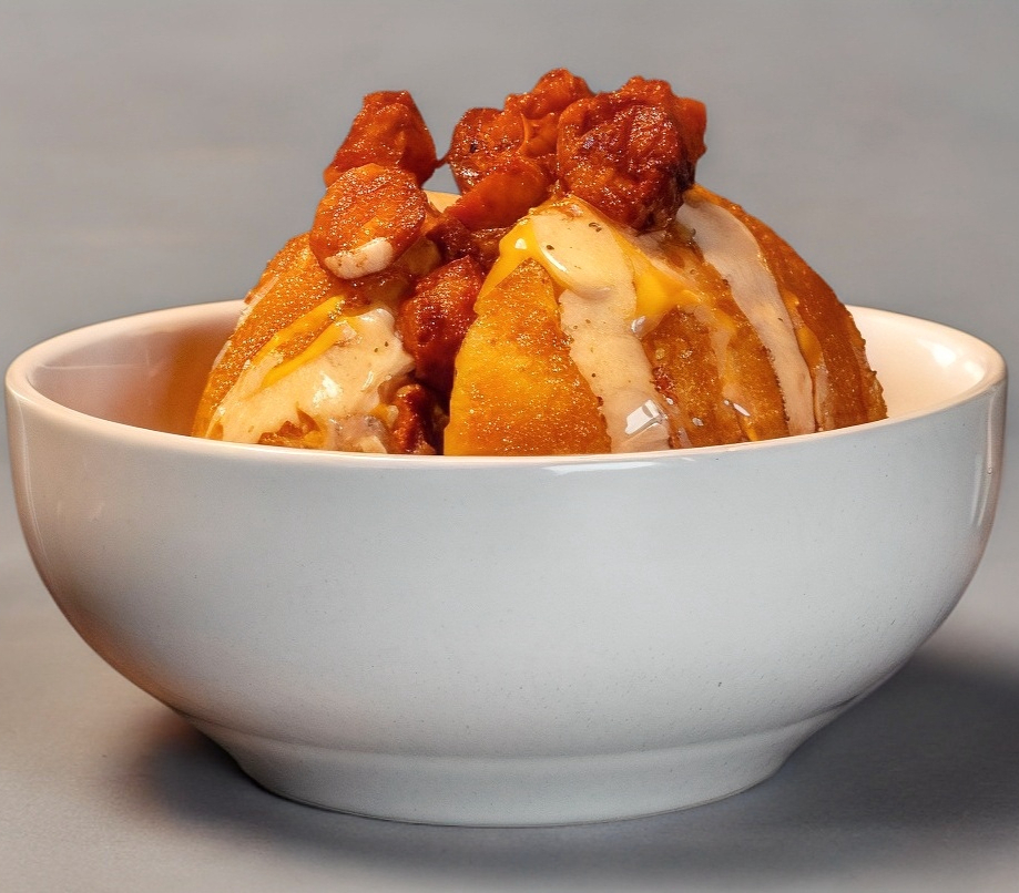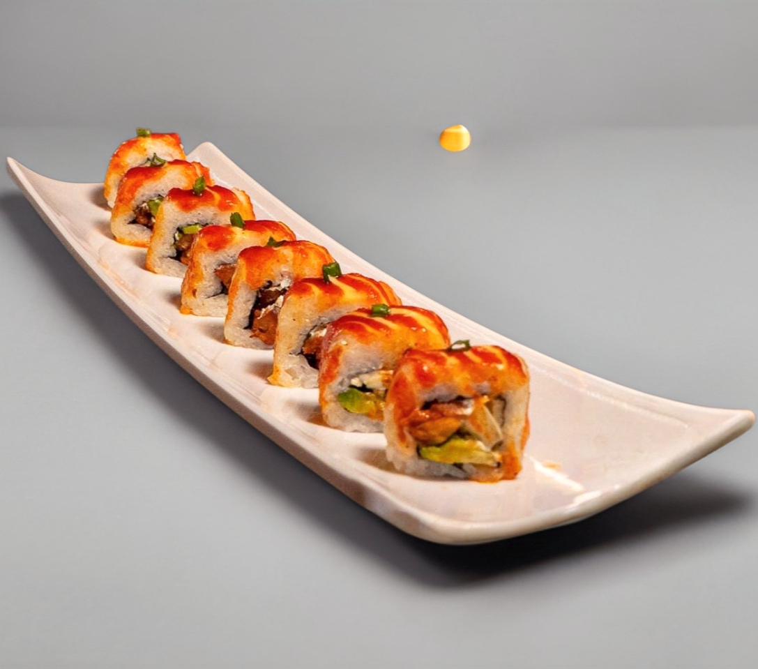 Pollo empanizado, pepino, tocino, filadelfia y aguacate. Bañada en salsa chipotle, anguila y soya.
