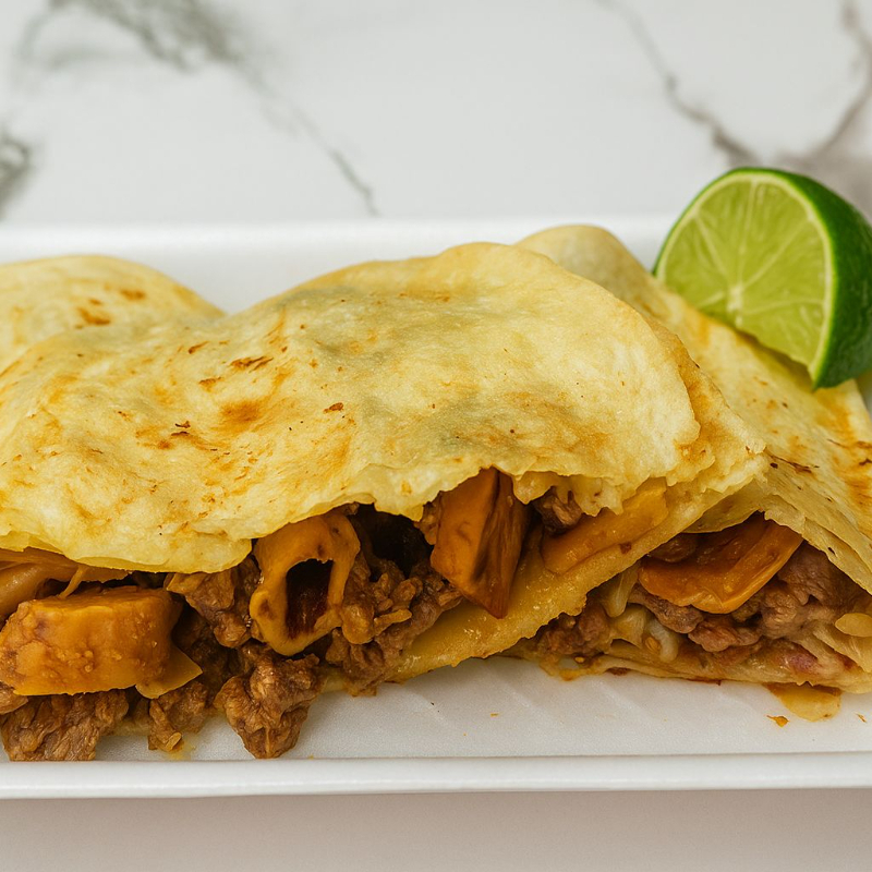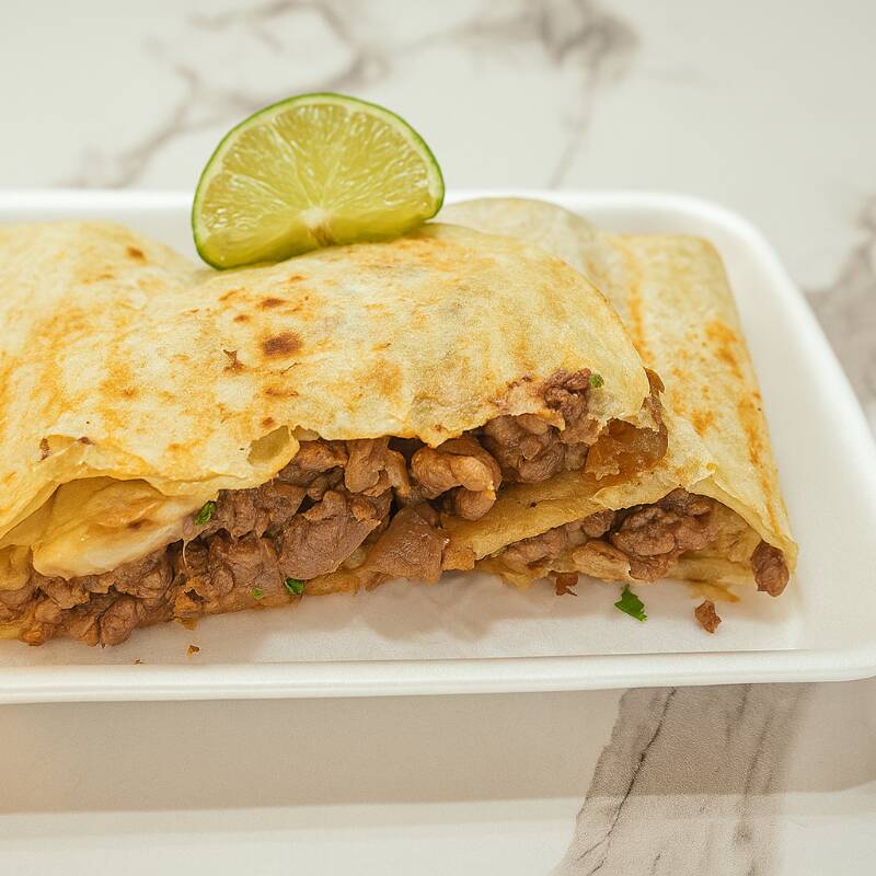 Una deliciosa mezcla de bistec y tripitas doraditas, servida en una tortilla grande y calientita, acompañada de cebolla, cilantro y salsas al gusto. ¡El sabor perfecto en cada bocado!