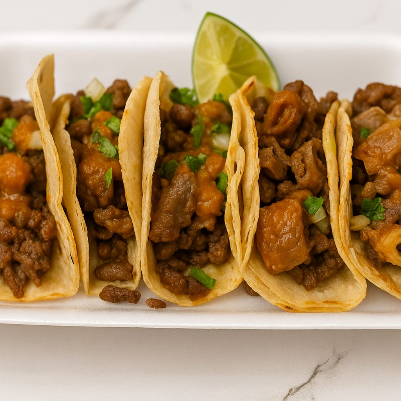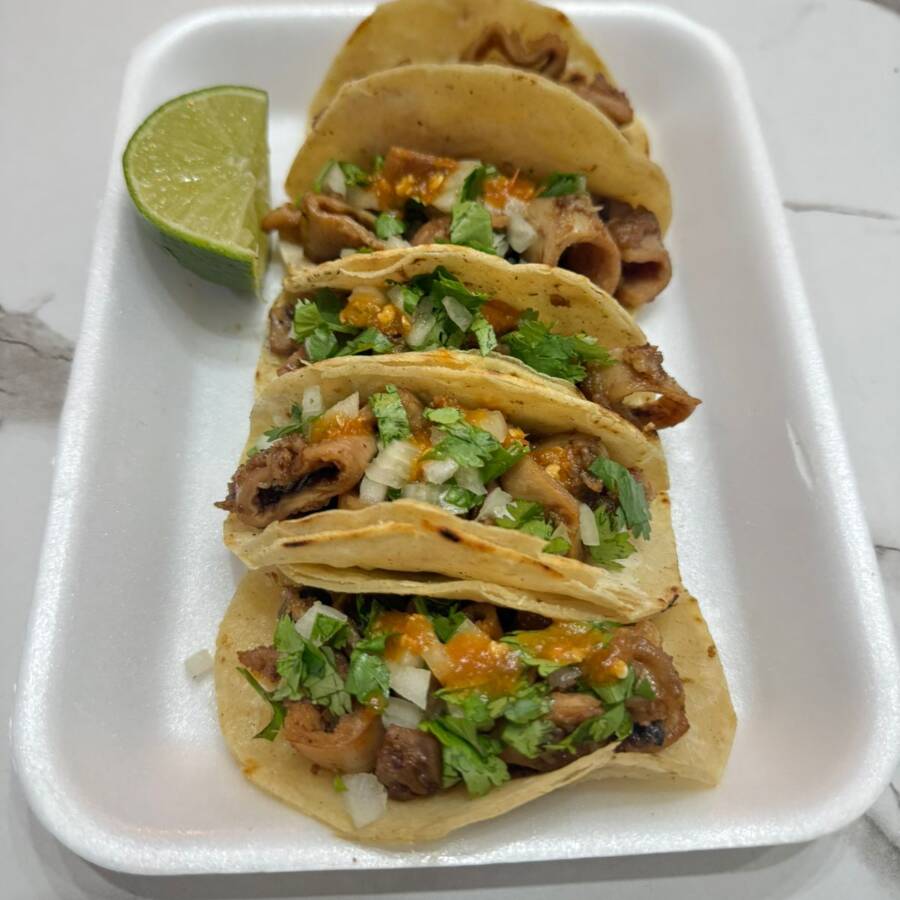 Cinco tacos bien servidos con tripitas doraditas y crujientes, en tortillas calientitas. Acompañados de cebolla, cilantro y salsas al gusto, ¡un manjar para los amantes del buen taco!