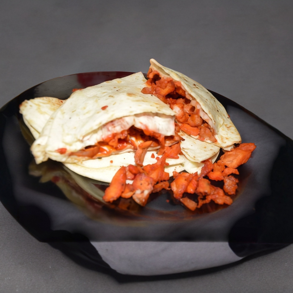 250g de bistec, tocino, pimiento morrón, jamón, cebolla y asadero, acompañado de salsas, verdura y tortillas.