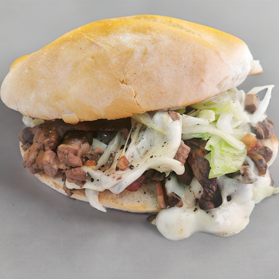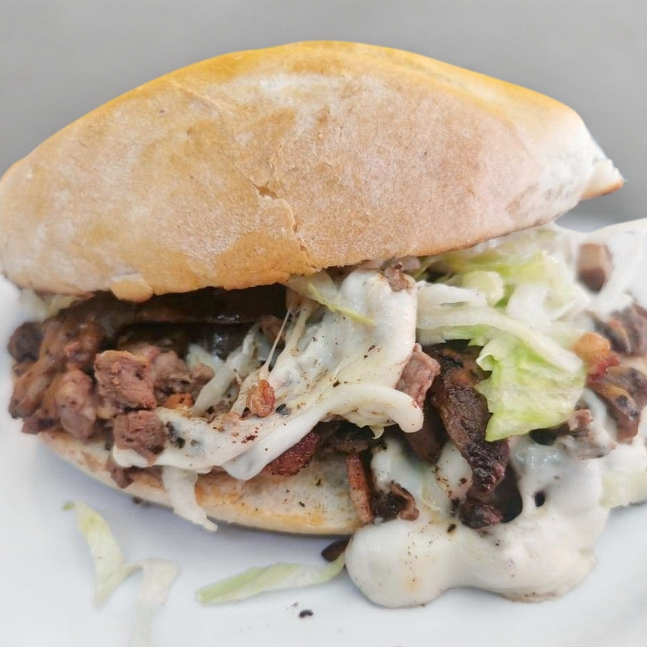 Morrón, cebolla, tocino, jamón, bistec, lechuga,tomate,mayonesa y asadero.