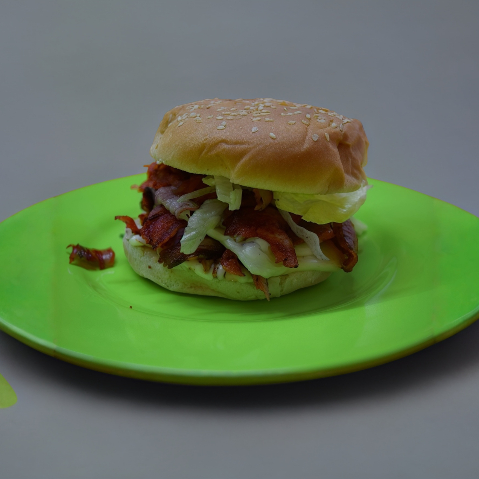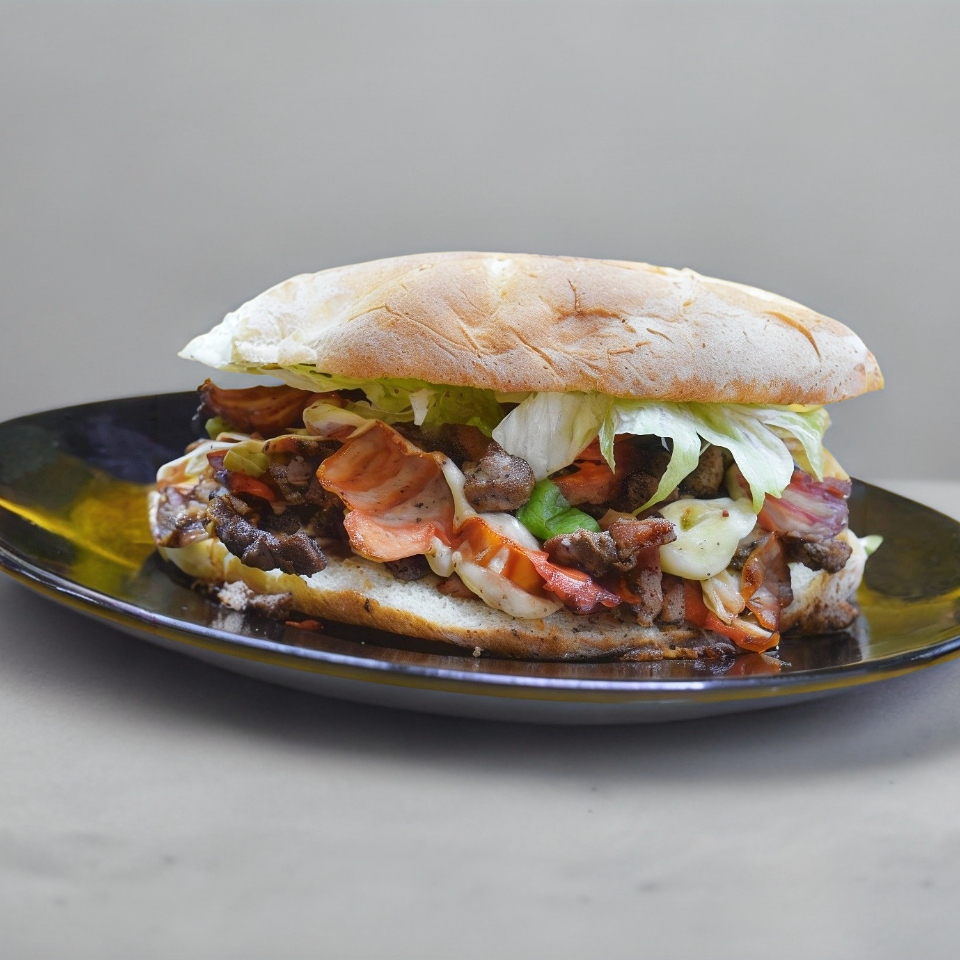 Morrón, cebolla, tocino, jamón, aguacate, bistec, lechuga, tomate,mayonesa y asadero.