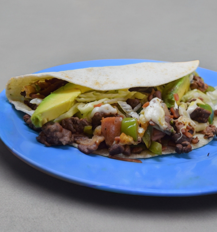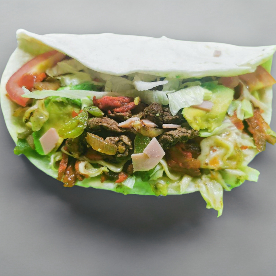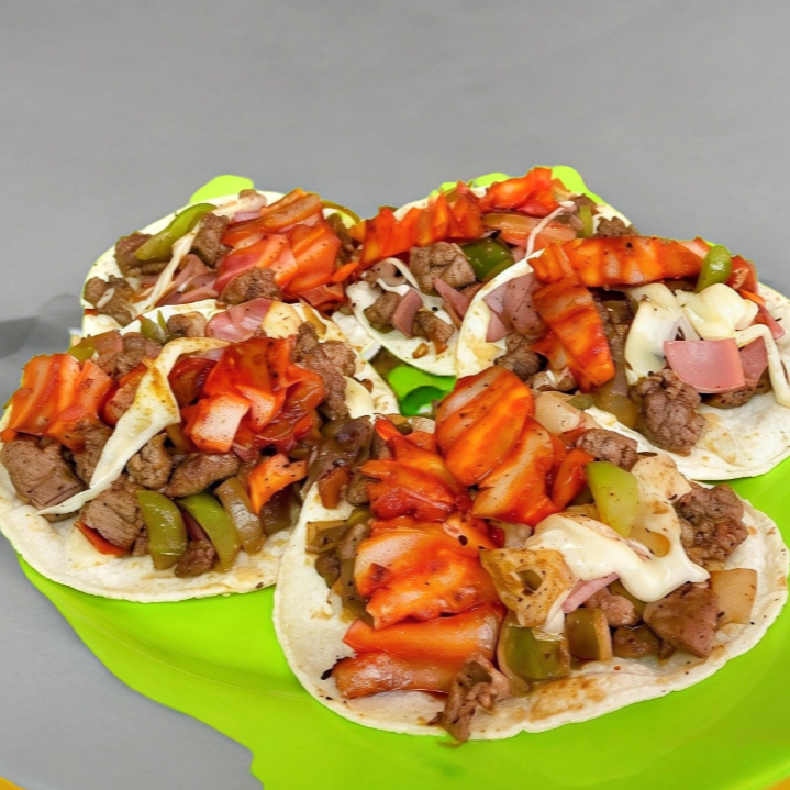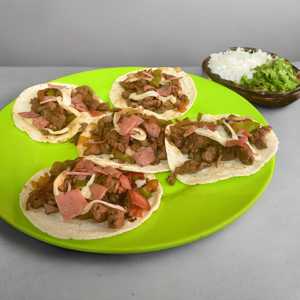 250g de bistec, tocino, jamón, pimiento morrón, cebolla, asadero y aguacate acompañado de tortillas, salsas y verdura.