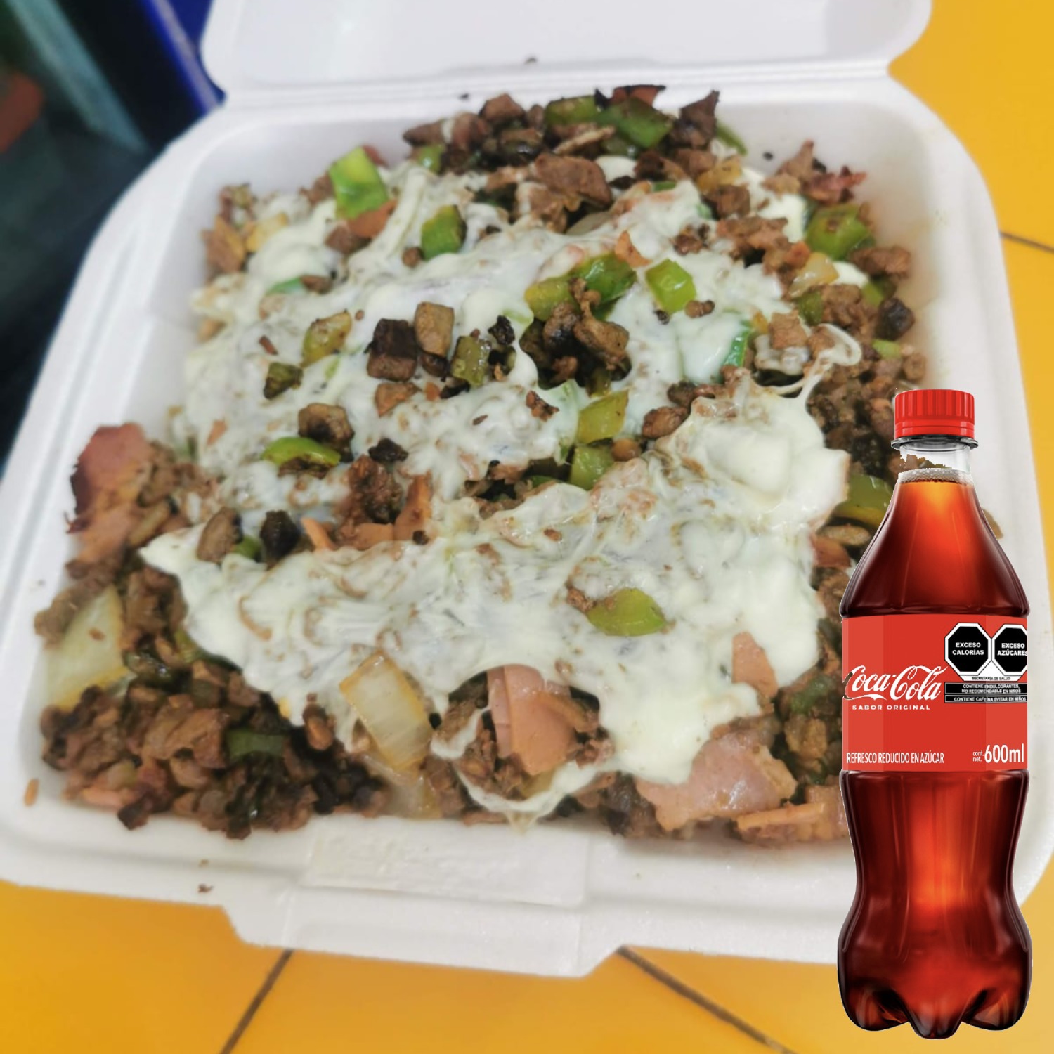 Pastor, bistec, jamón, tocino, cebolla y queso.