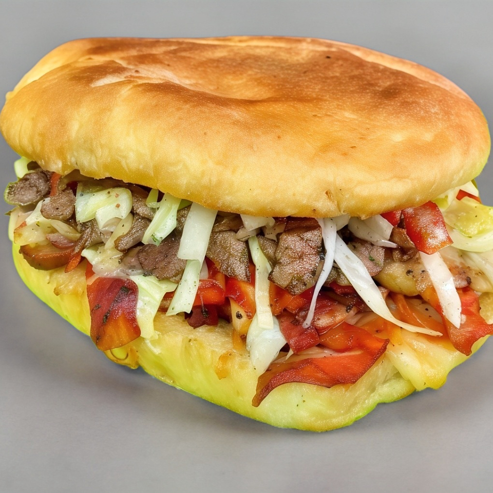 Morrón, cebolla, tocino, jamón, bistec, pastor, tomate, mayonesa, lechuga y asadero.