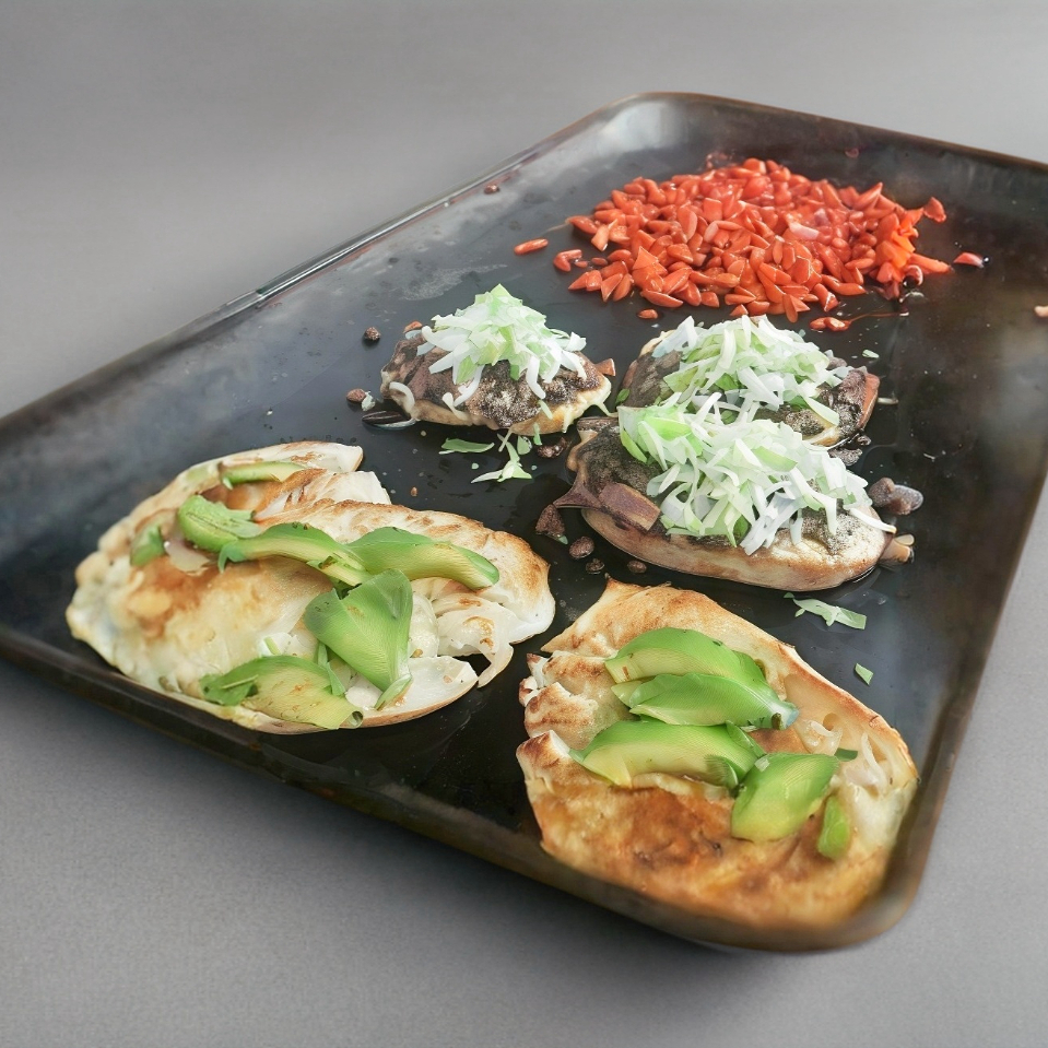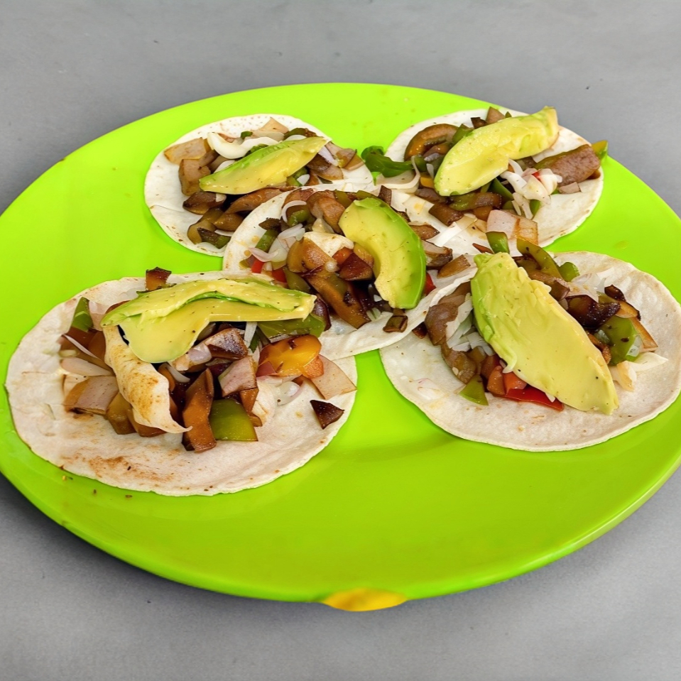250g de champiñones, tomate, cebolla,pimiento morrón, asadero y aguacate acompañado de verdura, salsa y tortillas.
