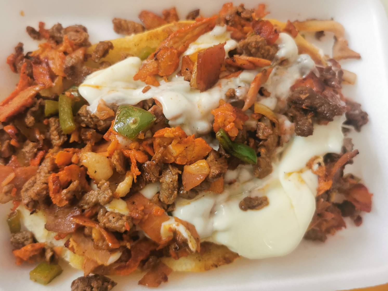Morrón, cebolla, tocino, jamón, bistec y queso.