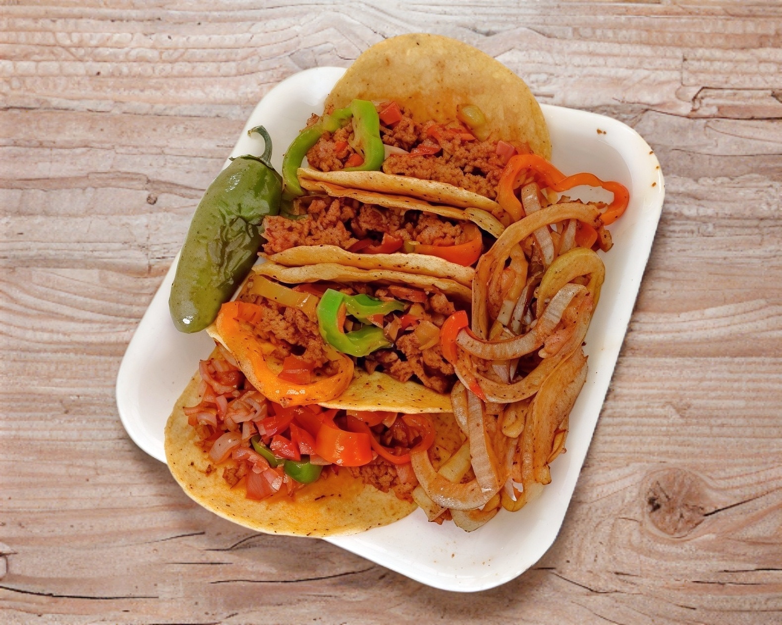 4 Tacos de Bistec en tortilla de maiz copia, elige las verduras y salsas que desees
