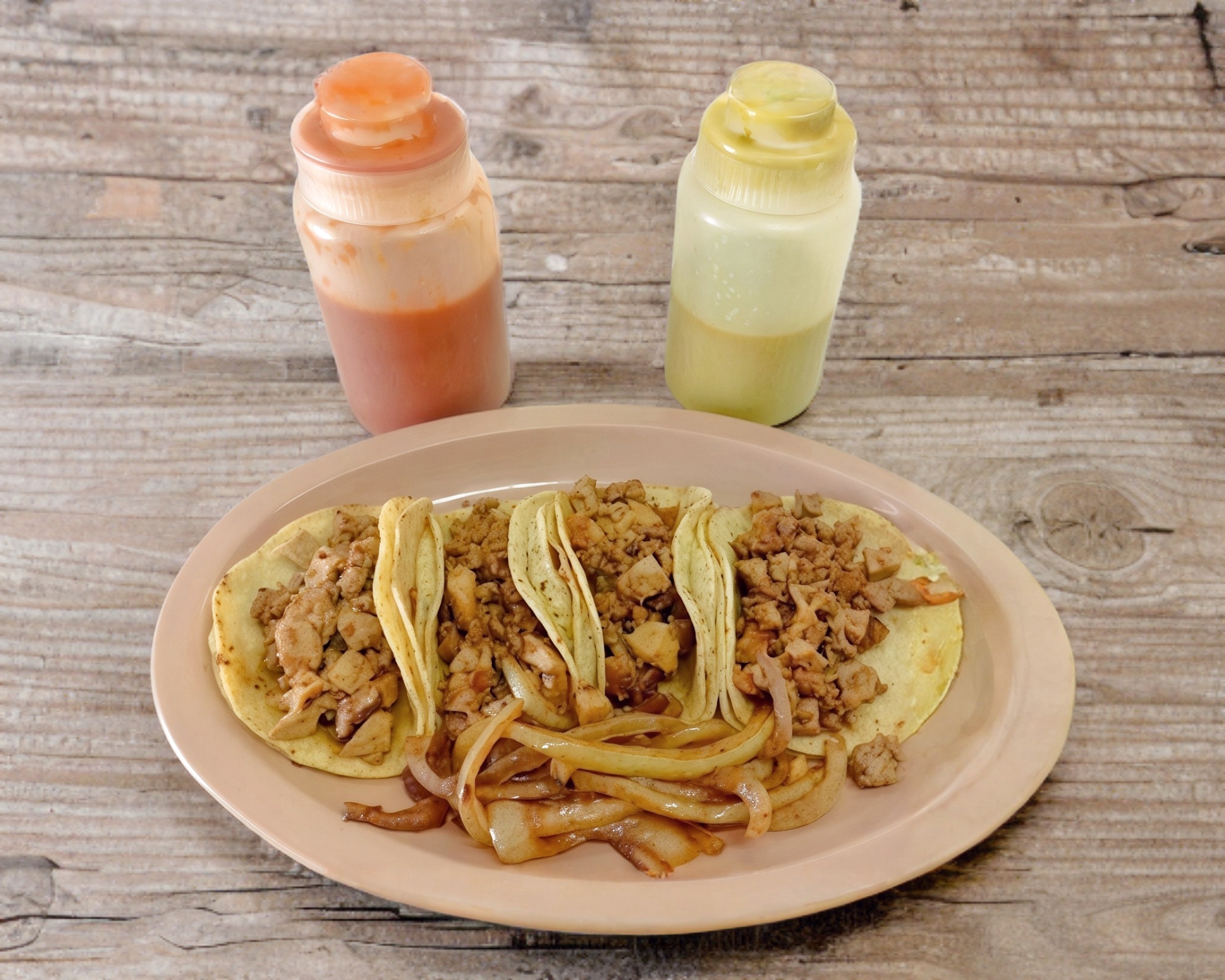 4 Tacos Campechaneados (bistec con ubre) en tortila de maiz copia. Selecciona las verduras y salsa de tu eleccion