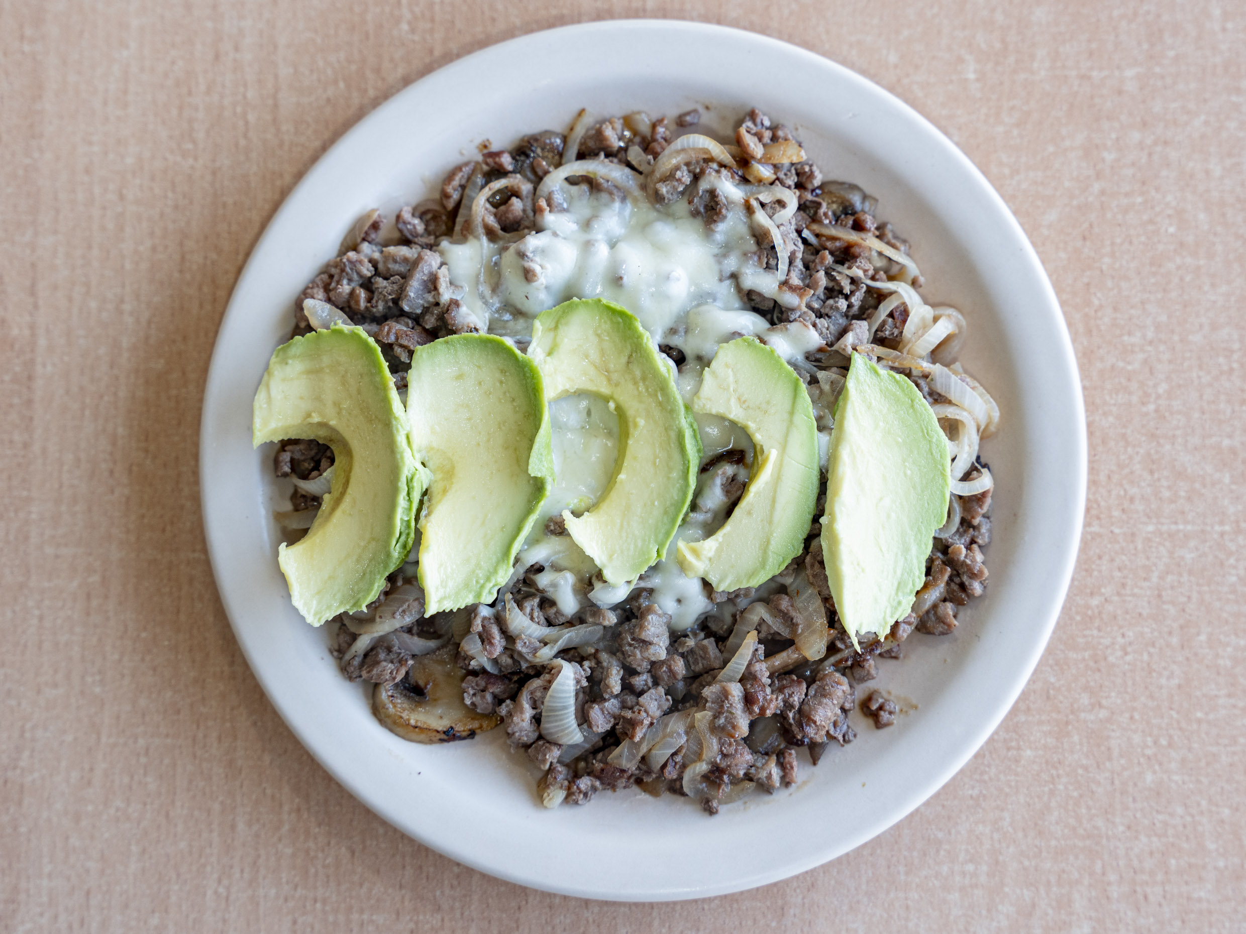 Bistec con cebolla, champiñones, aguacate y queso fundido. Acompañado de tortillas chicas, salsas y limones.