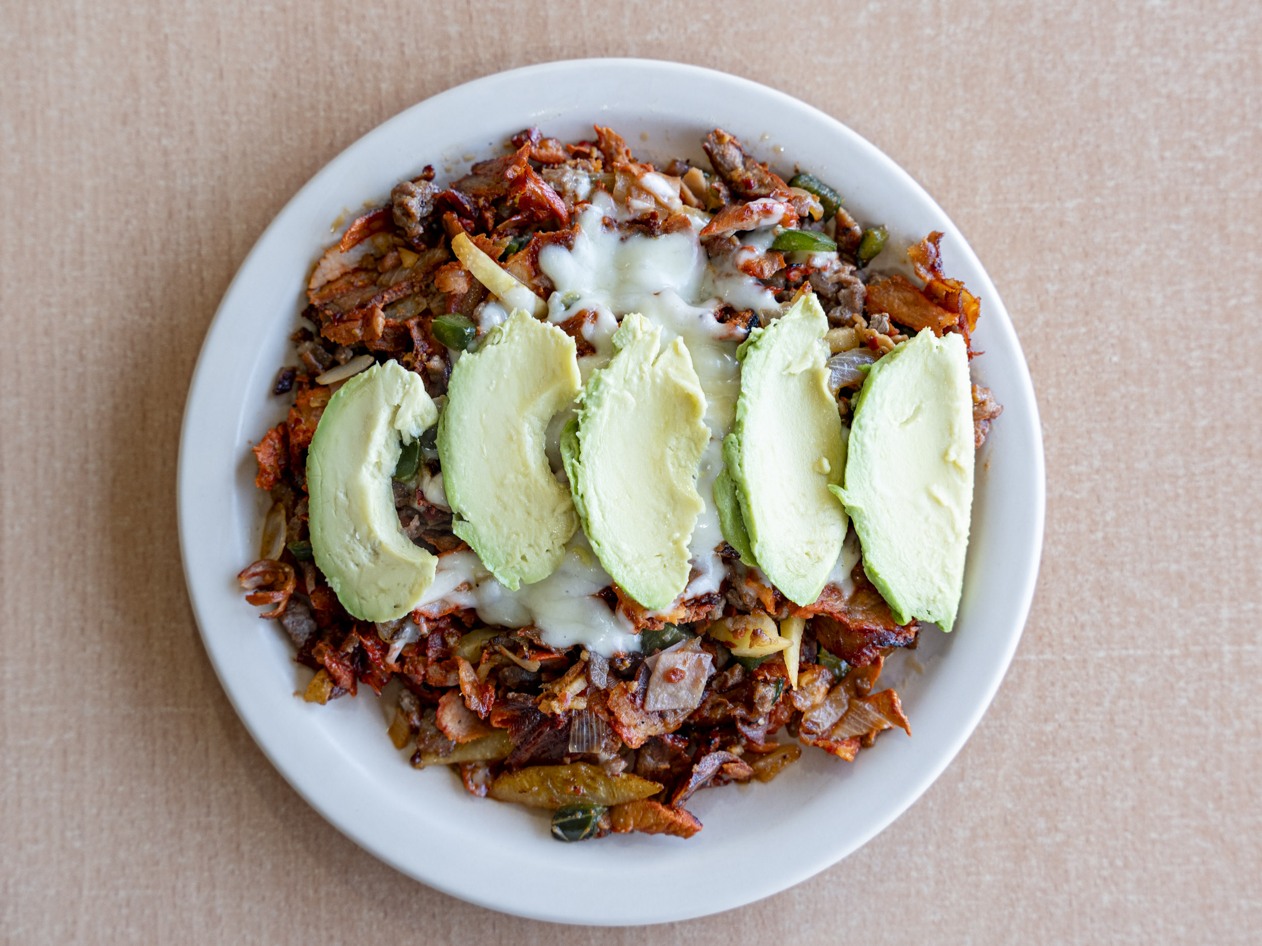 Bistec, tocino, jamón, aguacate y queso fundido. Acompañado de tortillas chicas, salsas y limones.