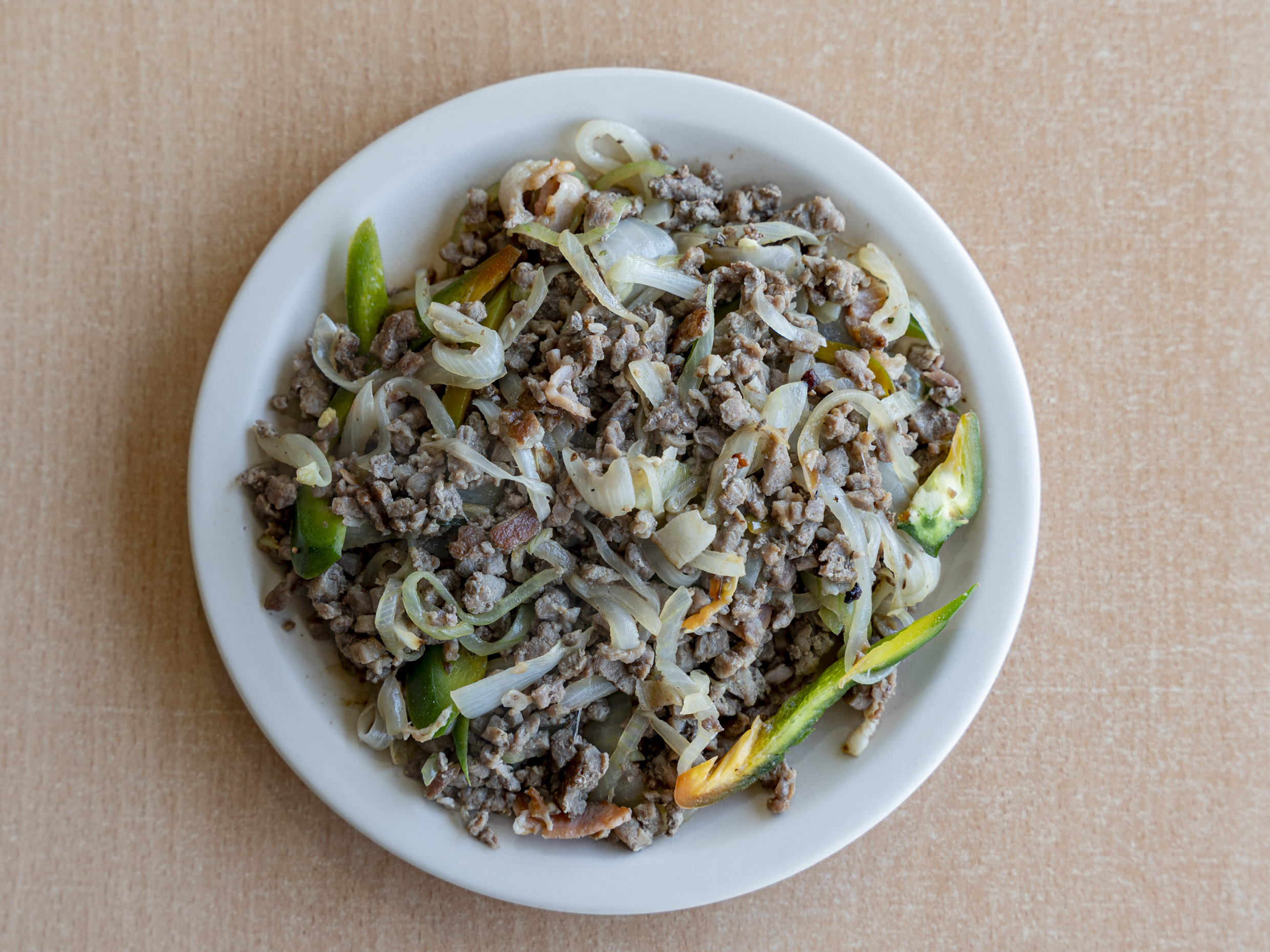 Bistec con tocino, cebolla y jalapeño, ¡un platillo fuerte y sabroso! Acompañado de tortillas chicas, salsas y limones.