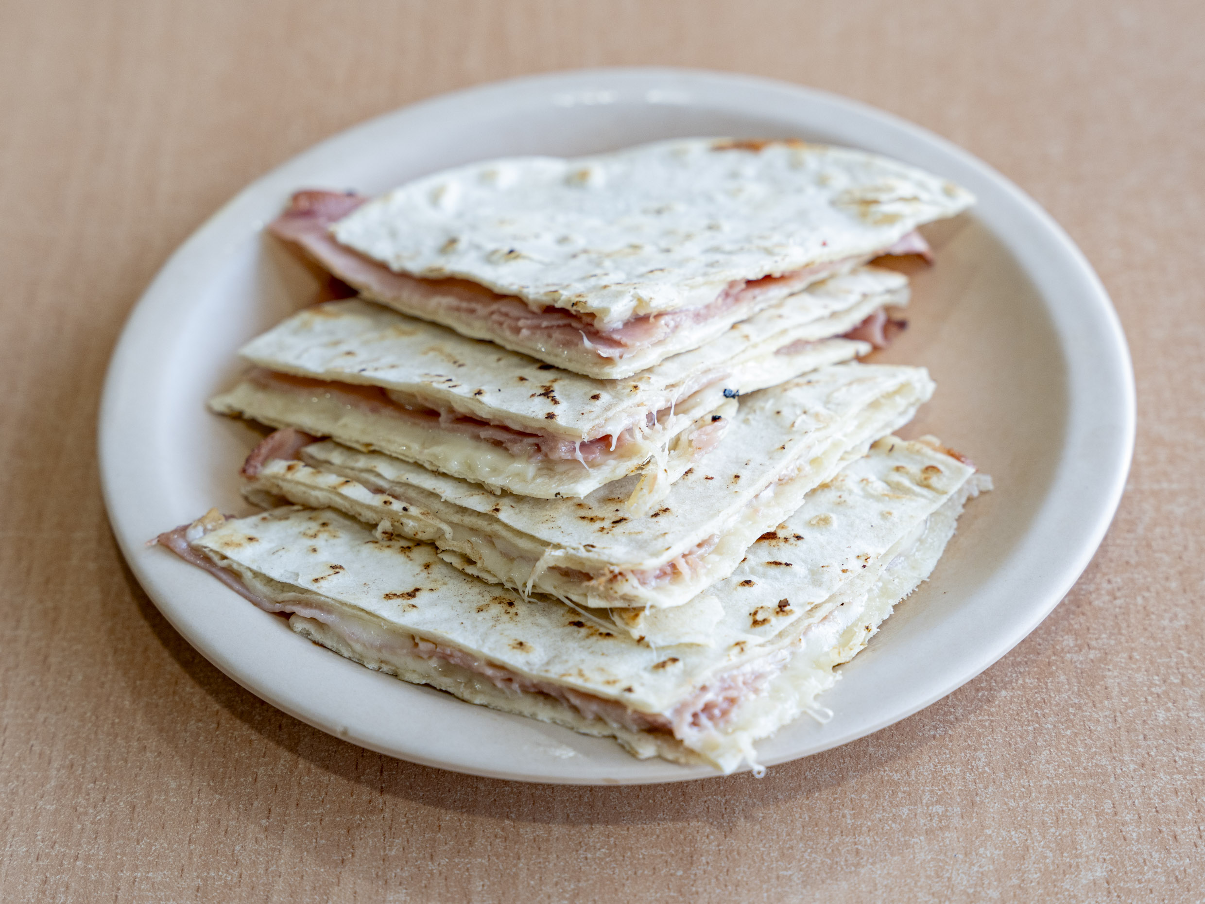 Un clásico: jamón y queso fundido en tortillas de harina. Acompañado de salsas y limones.