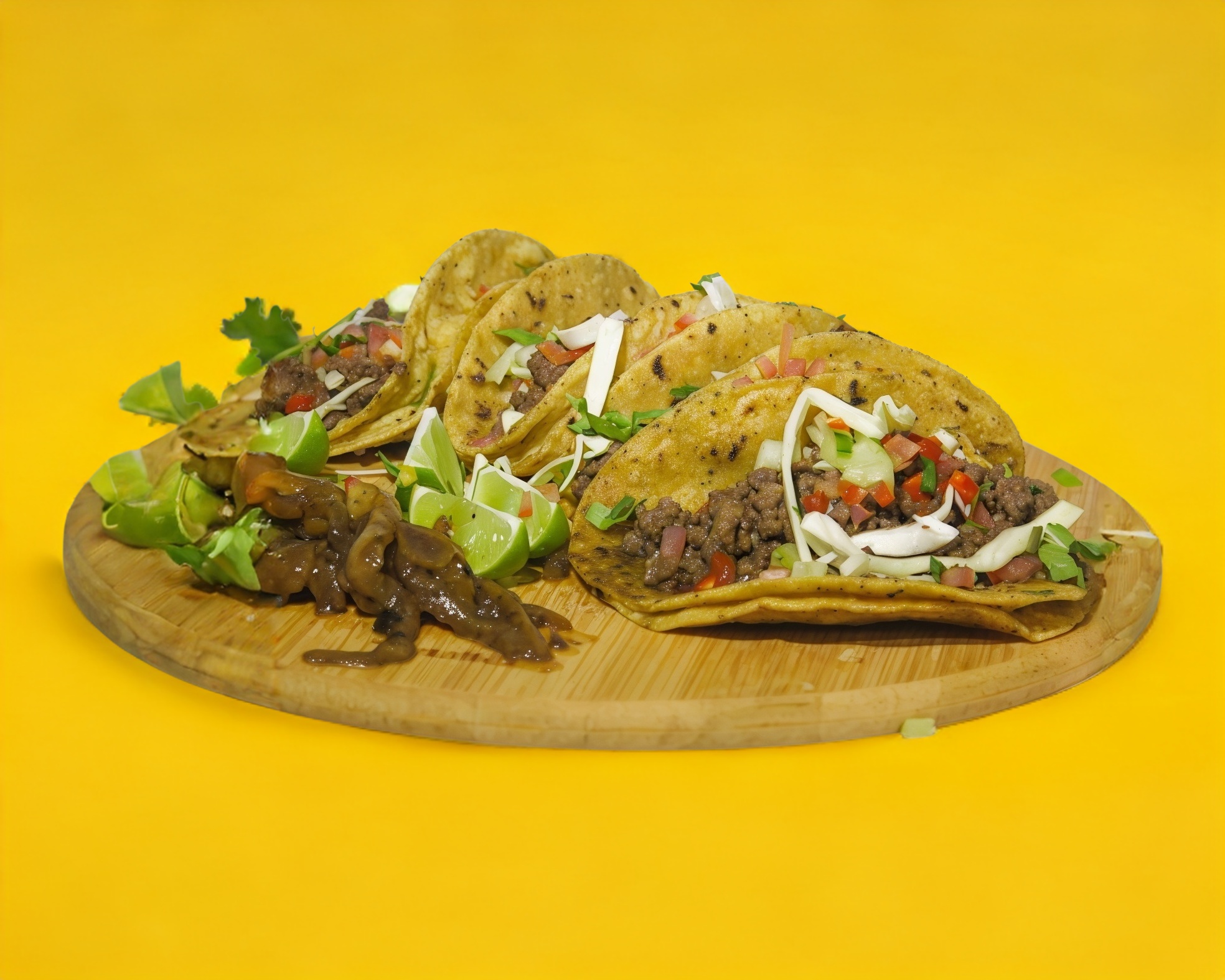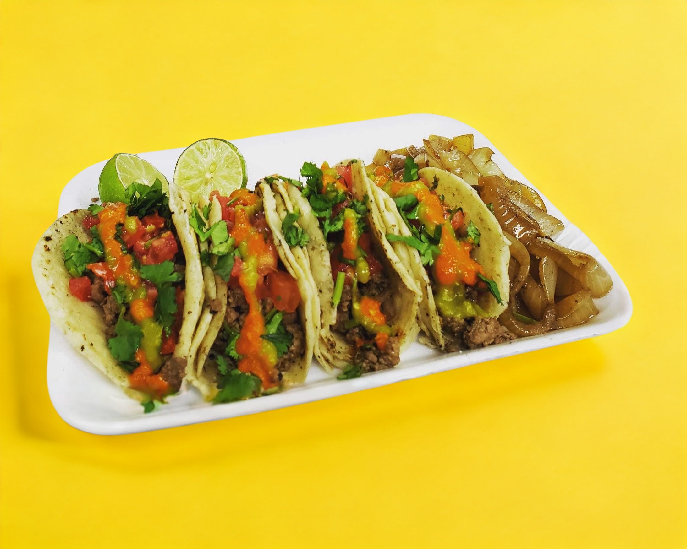Orden de 4 tacos de bistec con asadero y frijoles en doble tortilla de maiz.