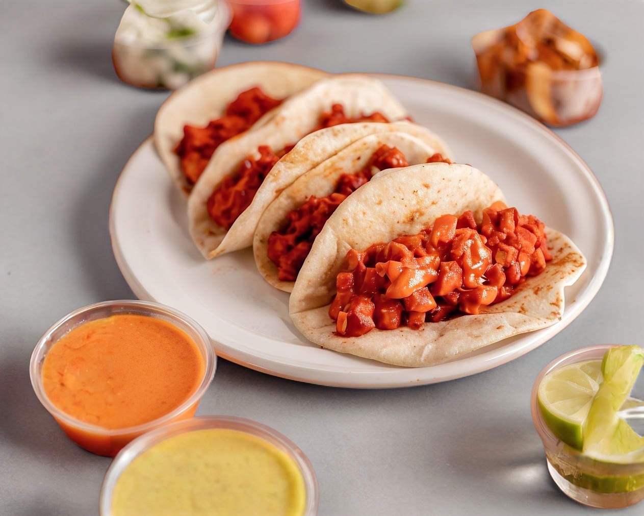 4 piezas. Tacos de harina con pastor, elige en la sección de extras tus verduras y salsa favoritos.
