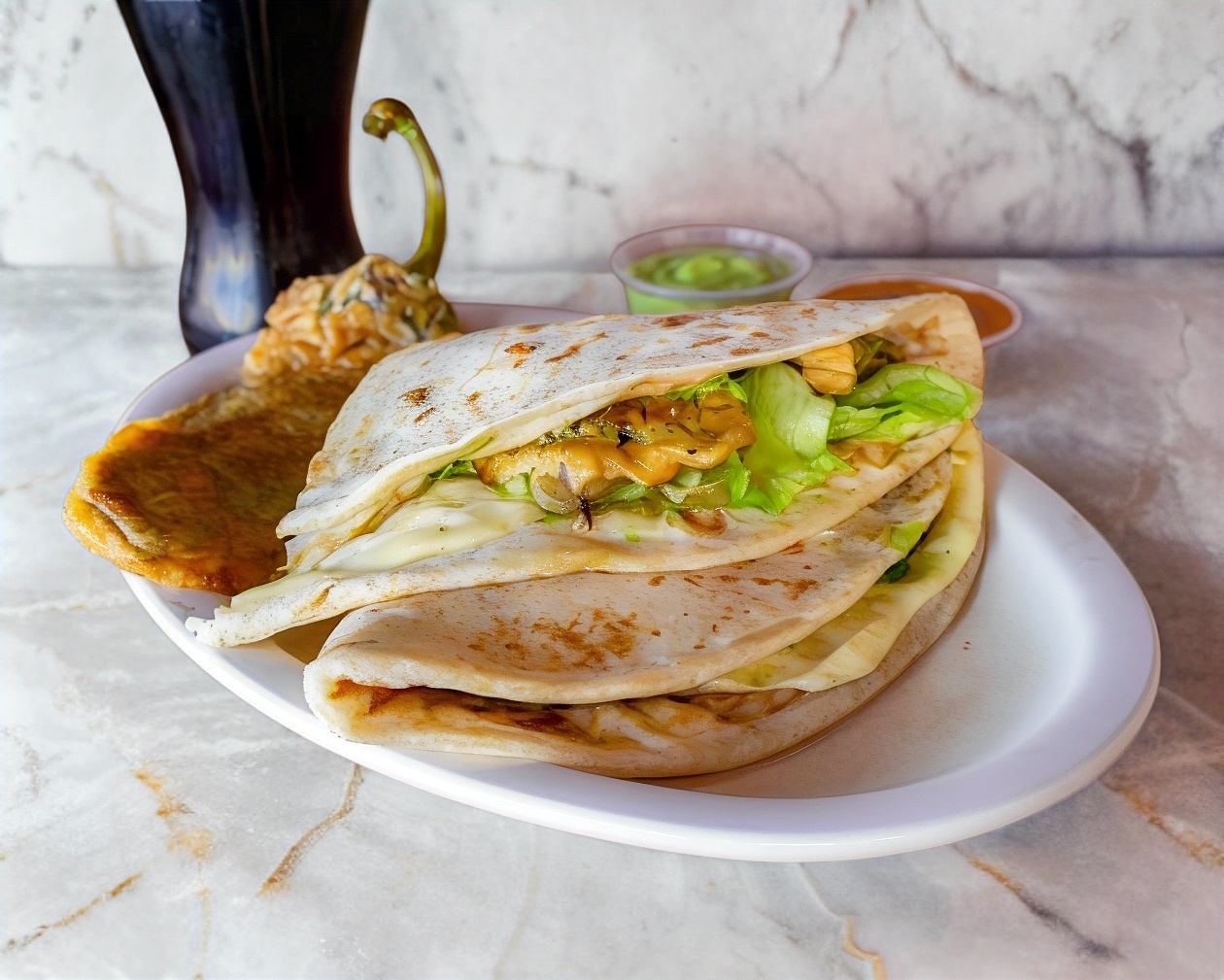 Deshebrada, aguacate, crema, lechuga, tomate, queso asadero.