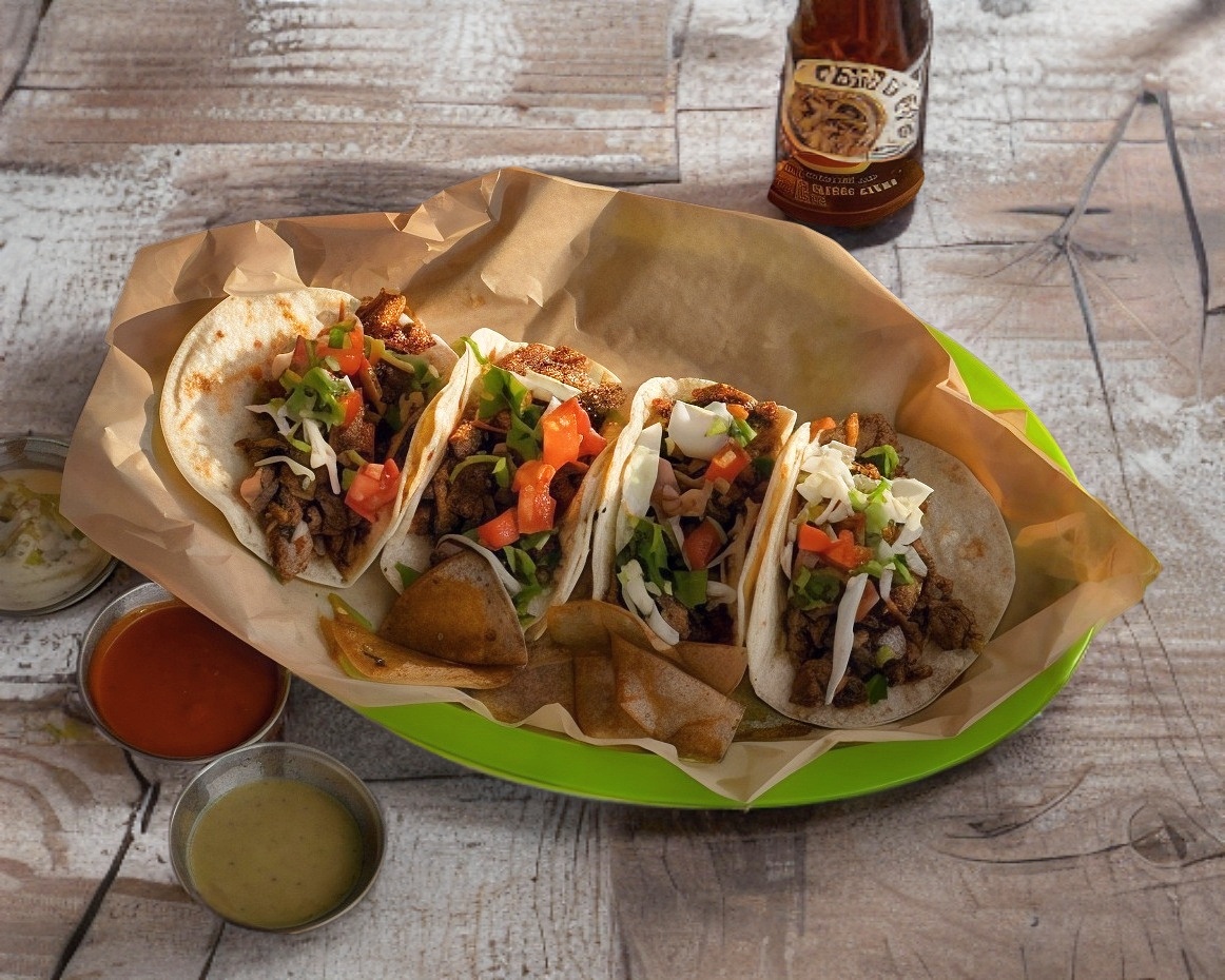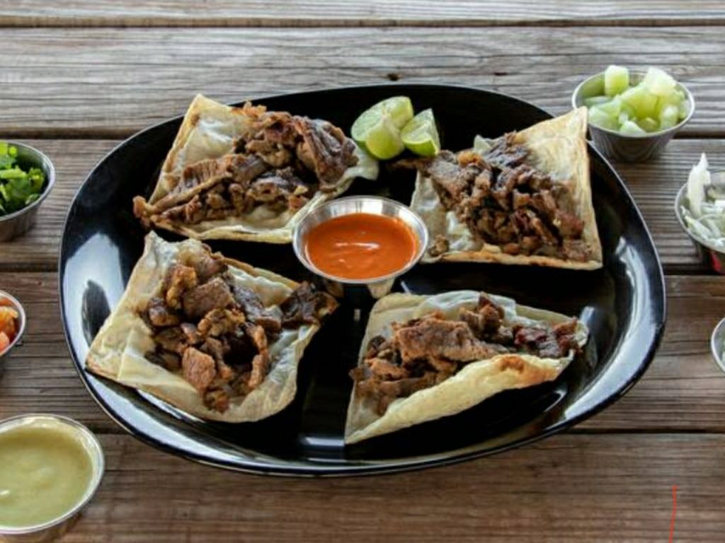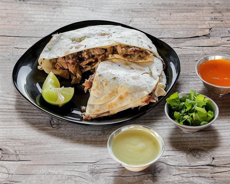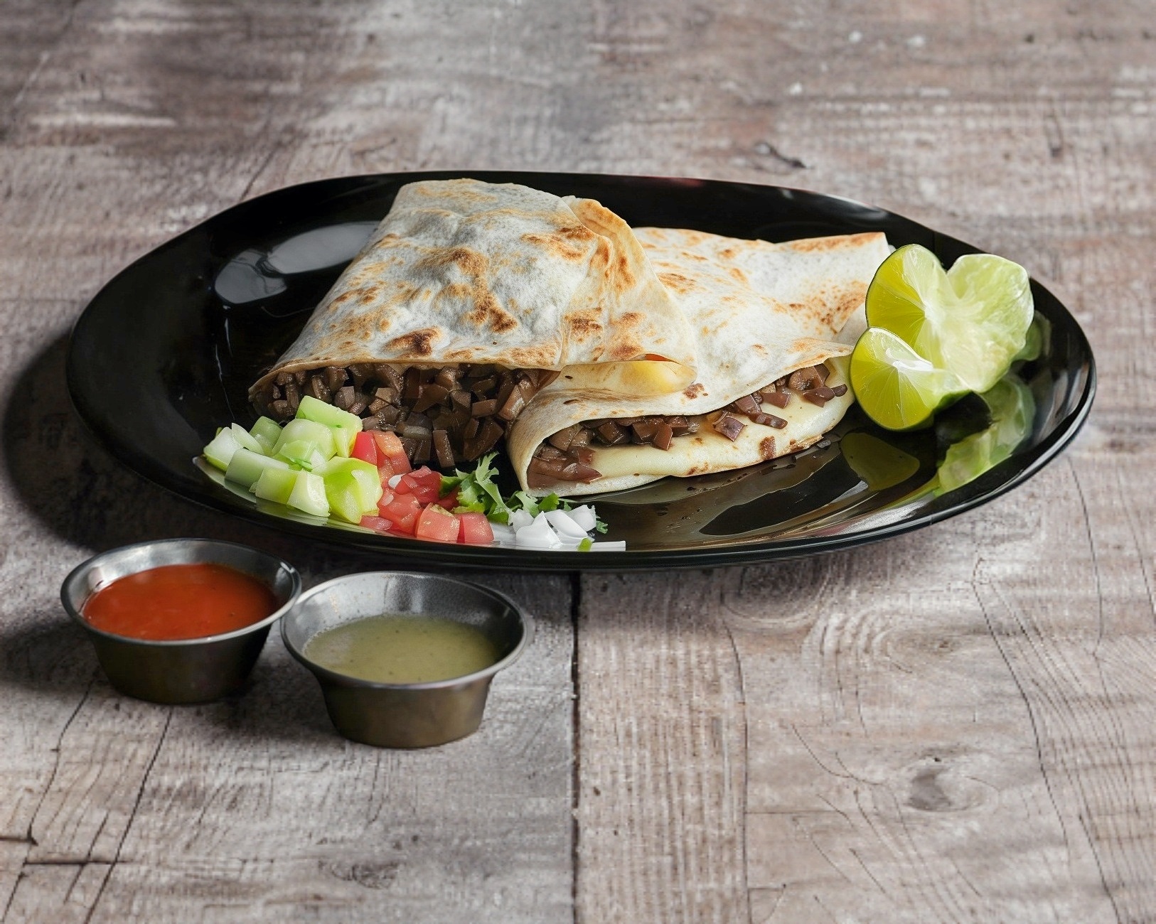 Tortilla a base de harina de maiz grande con asadero y carne asada de res , salsa de la casa