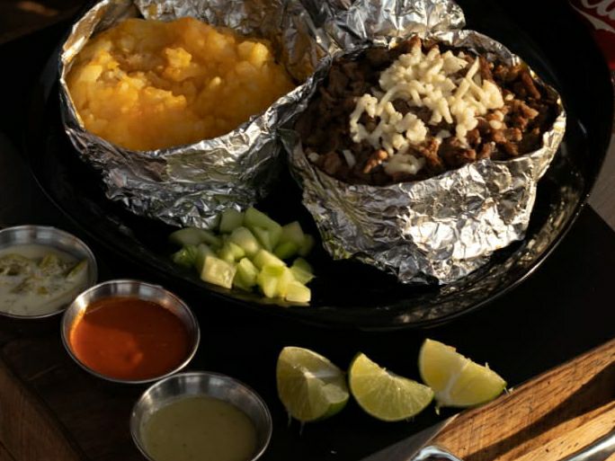Papa Asada, Mantequilla, Carne Asada, Asadero, Aguacate.