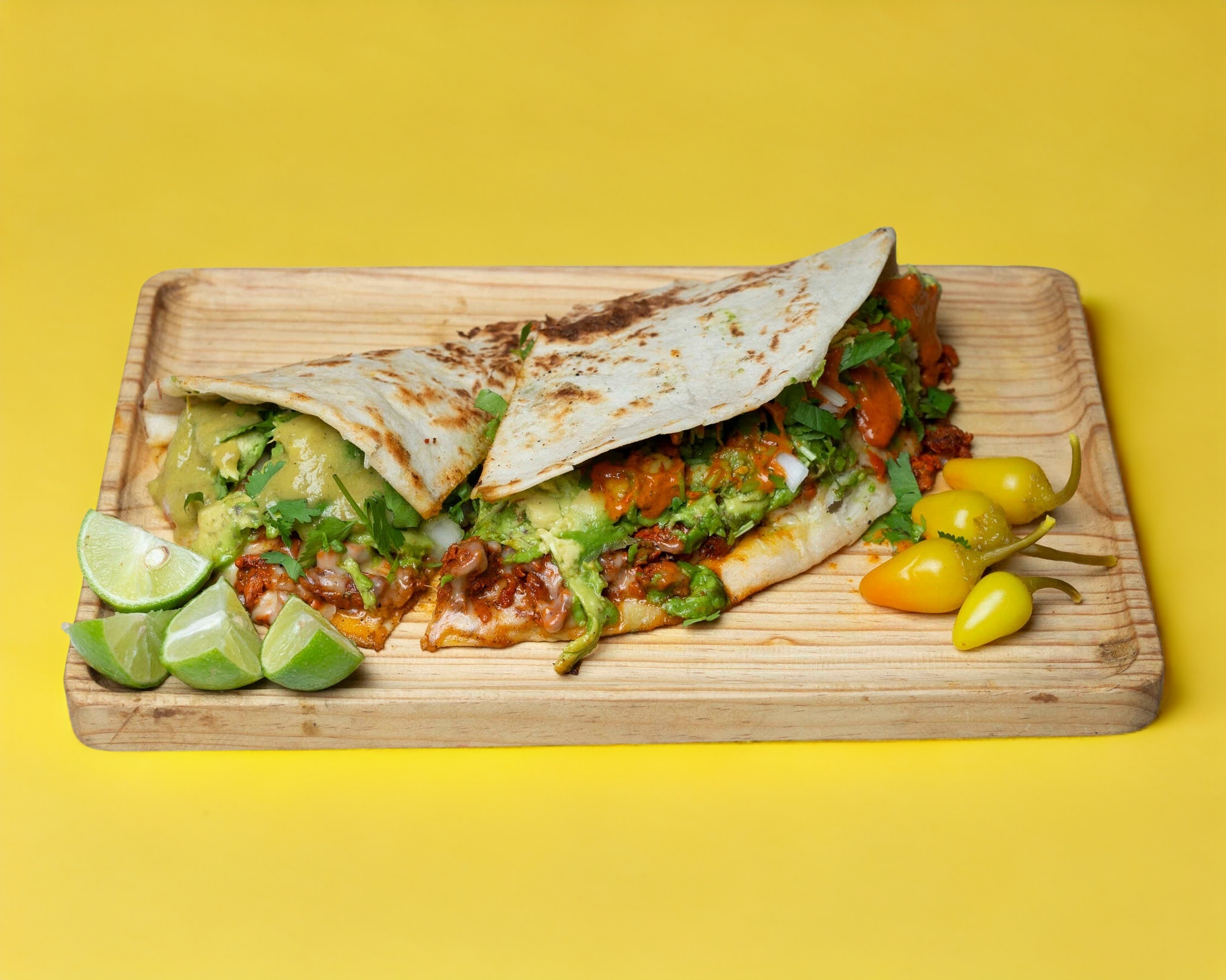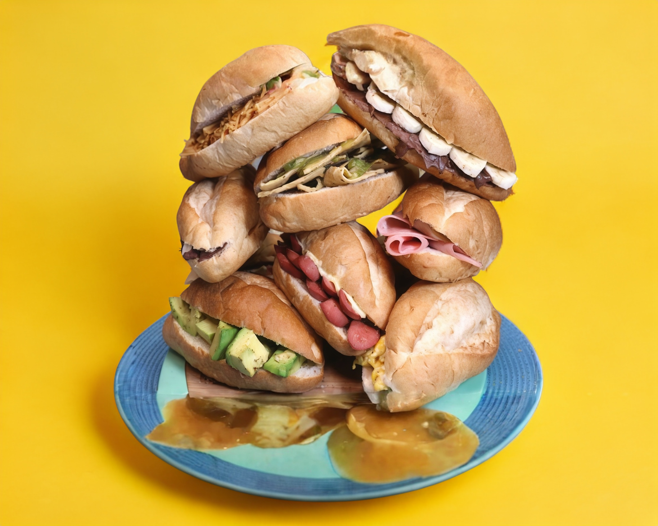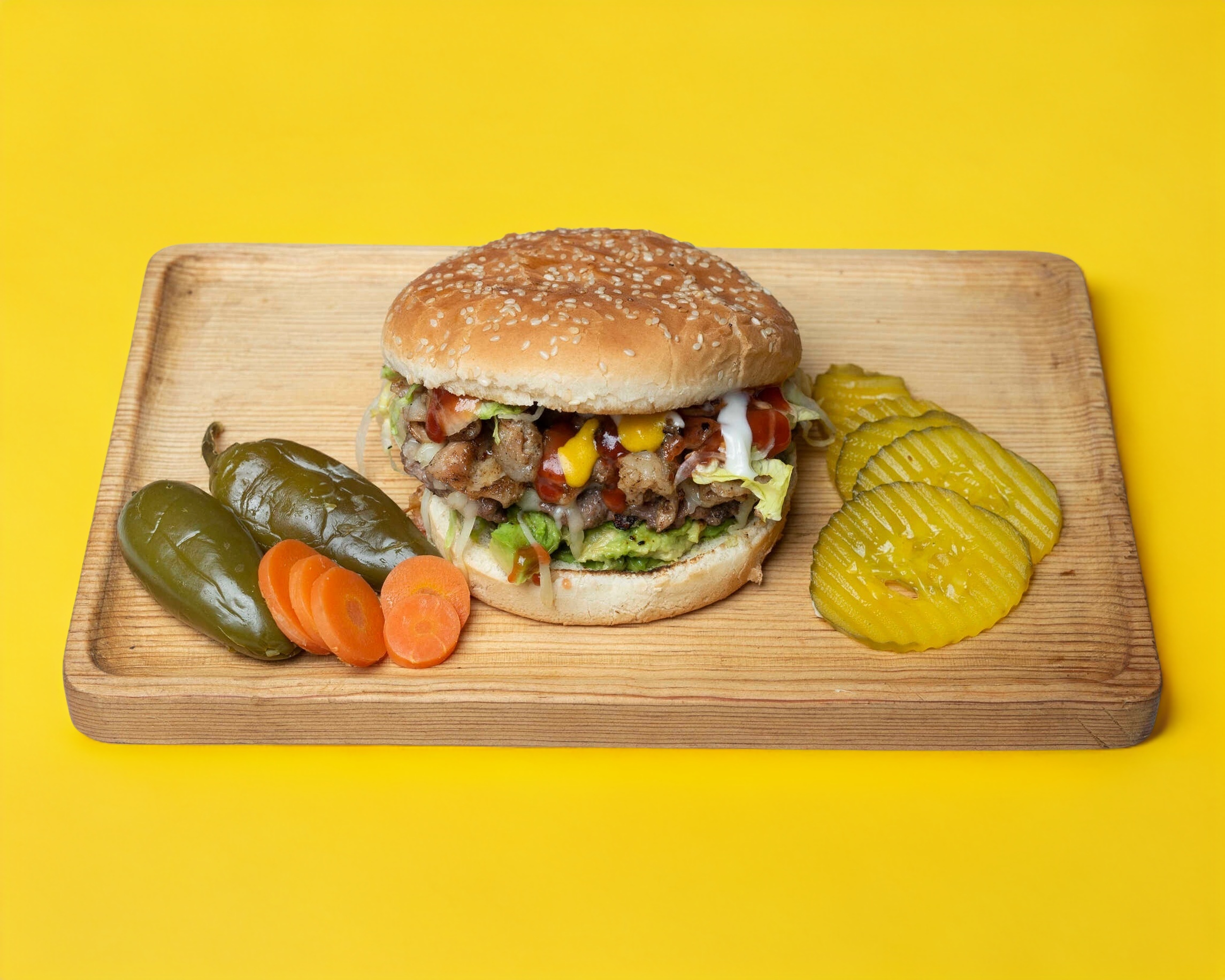 2 Carnes, aguacate,lechuga, tomate, cebolla morada, cátsup, mostaza, pepinillos y cebolla morada.q