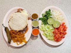 Montado en tortilla de harina con asadero, frijoles con chorizo, carne de res y salsa. Verdura aparte (tomate, limón, pepino, cebolla, cilantro).