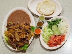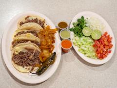 Tacos de carne de res con de tortilla de maíz o harina, frijoles y asadero.