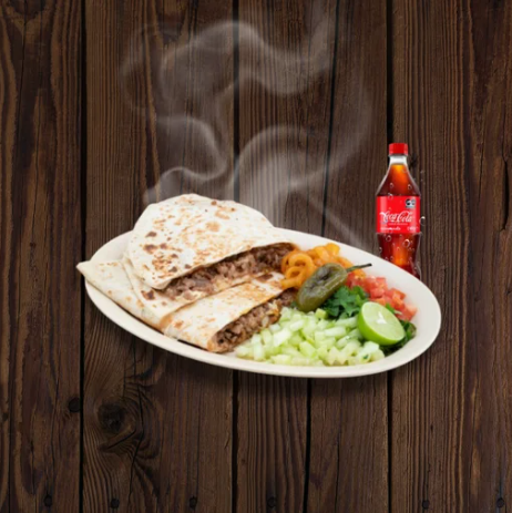 Quesadilla en tortilla de harina chica, frijoles, asadero y bistec.