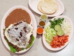 Montado en tortilla de harina con asadero, frijoles con chorizo, carne de res y salsa. Verdura aparte (tomate, limón, pepino, cebolla, cilantro).