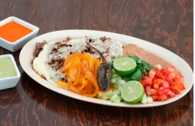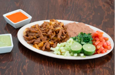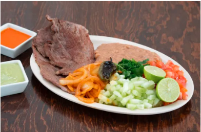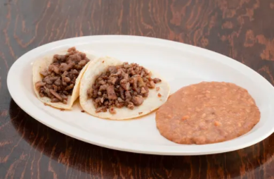 Carne de res con tortilla de harina o maíz, frijoles y asadero.