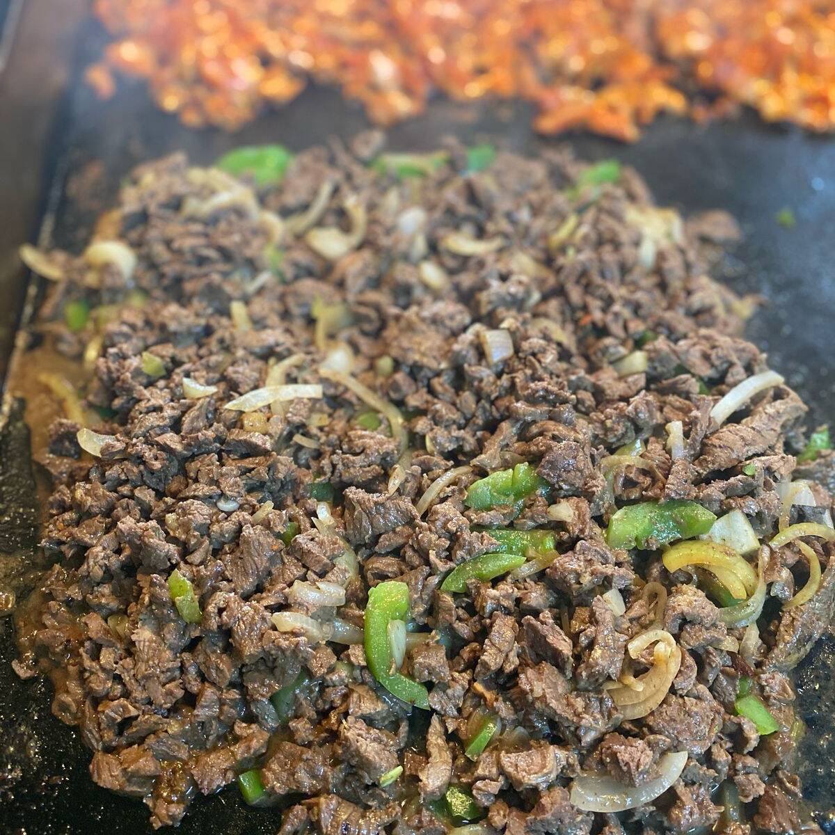 tacos de alambre(pimiento morron,cebolla y queso) con carne alpastor