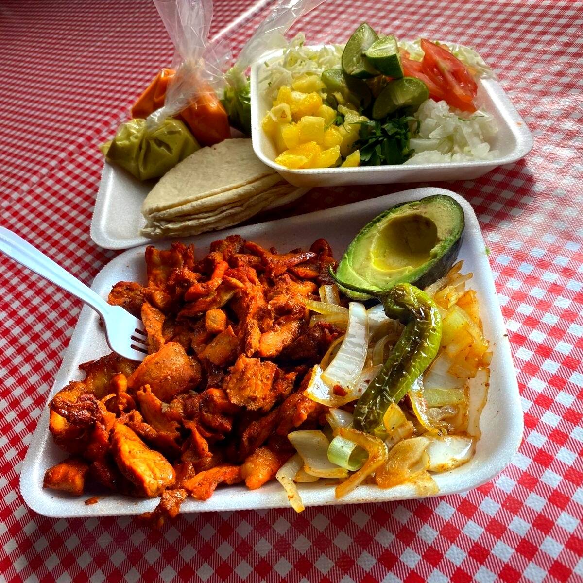 carne ALPASTOR con tortillas,cebolla guisada, aguacate,verdura y salsas aparte