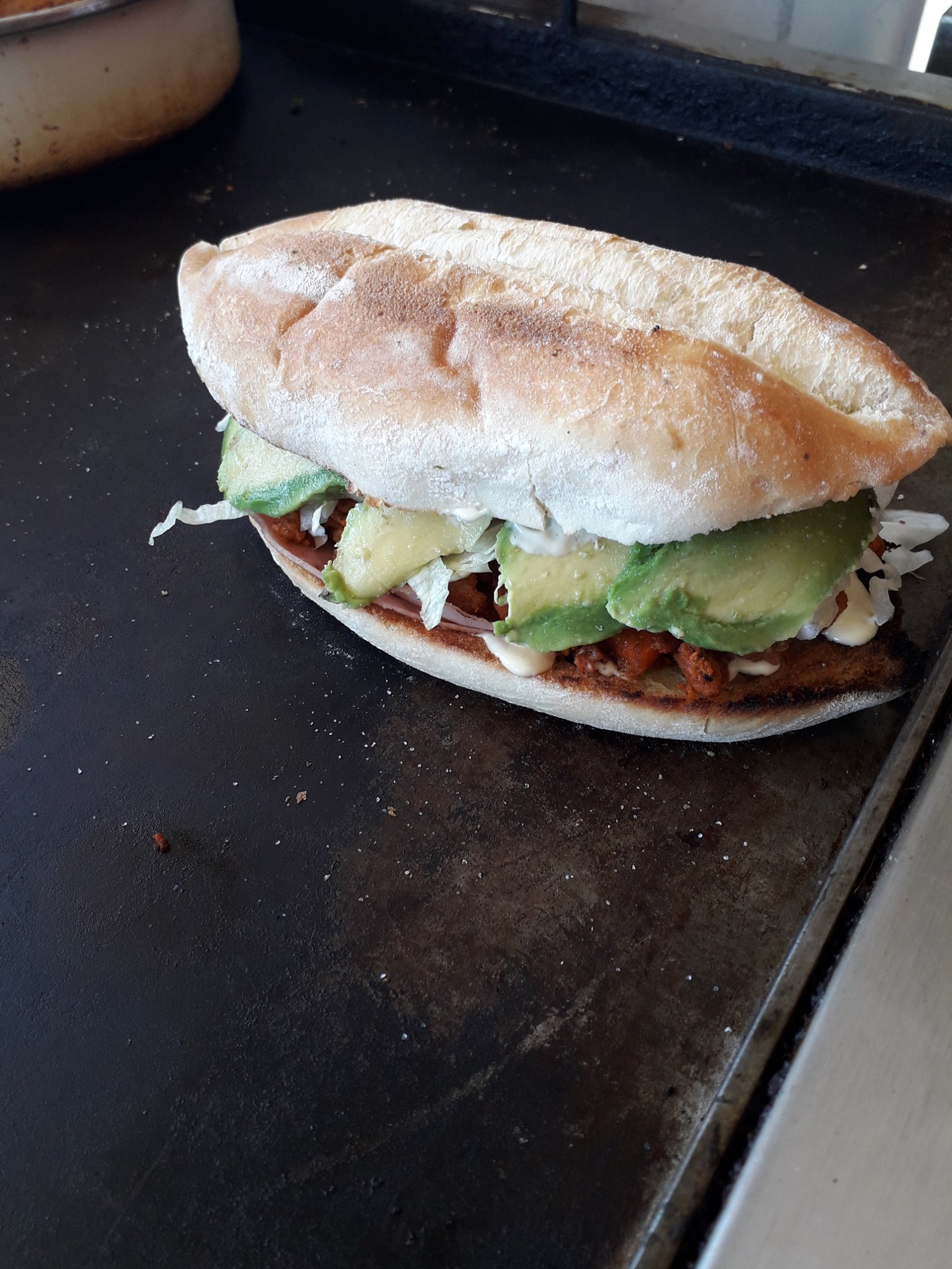 Sabroso pan blanco, con deliciosa carne de puerco, mayonesa, jamón, queso, lechuga, tomate y aguacate.