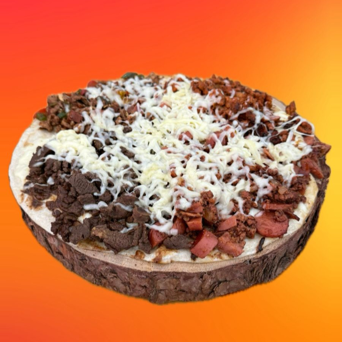 CAMA DE TORTILLA MEGA , CON QUESO ASADERO DE BASE , 1 A 4 CARNES A ELEGIR TODO GRATINADO