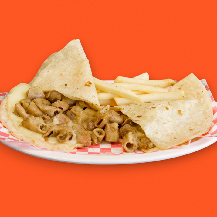 4 TACOS DE TRIPITAS EN TORTILLA DE HARINA CON QUESO ASADERO GRATINADO
