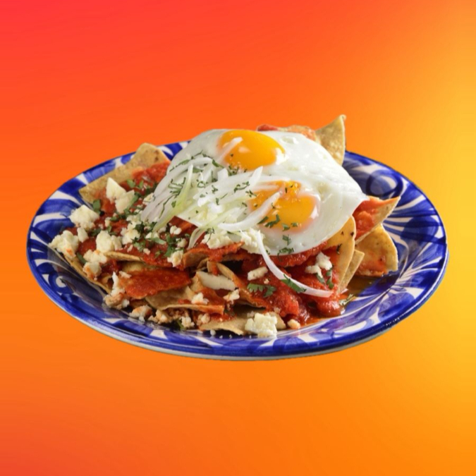 CHILAQUILES ROJOS CON QUESO, CREMA Y BISTEC A LA MEXICANA
