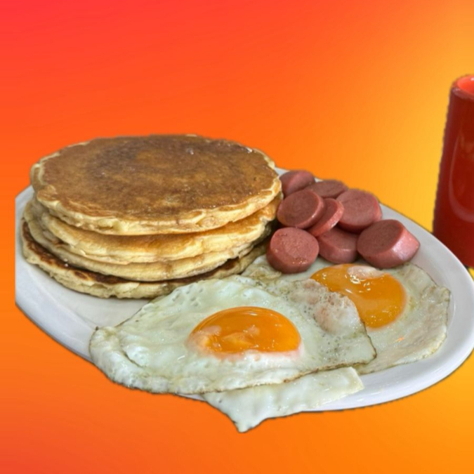 3 HOT CAKES . DOS HUEVOS ESTRELLADOS, SALCHICA GUISADA